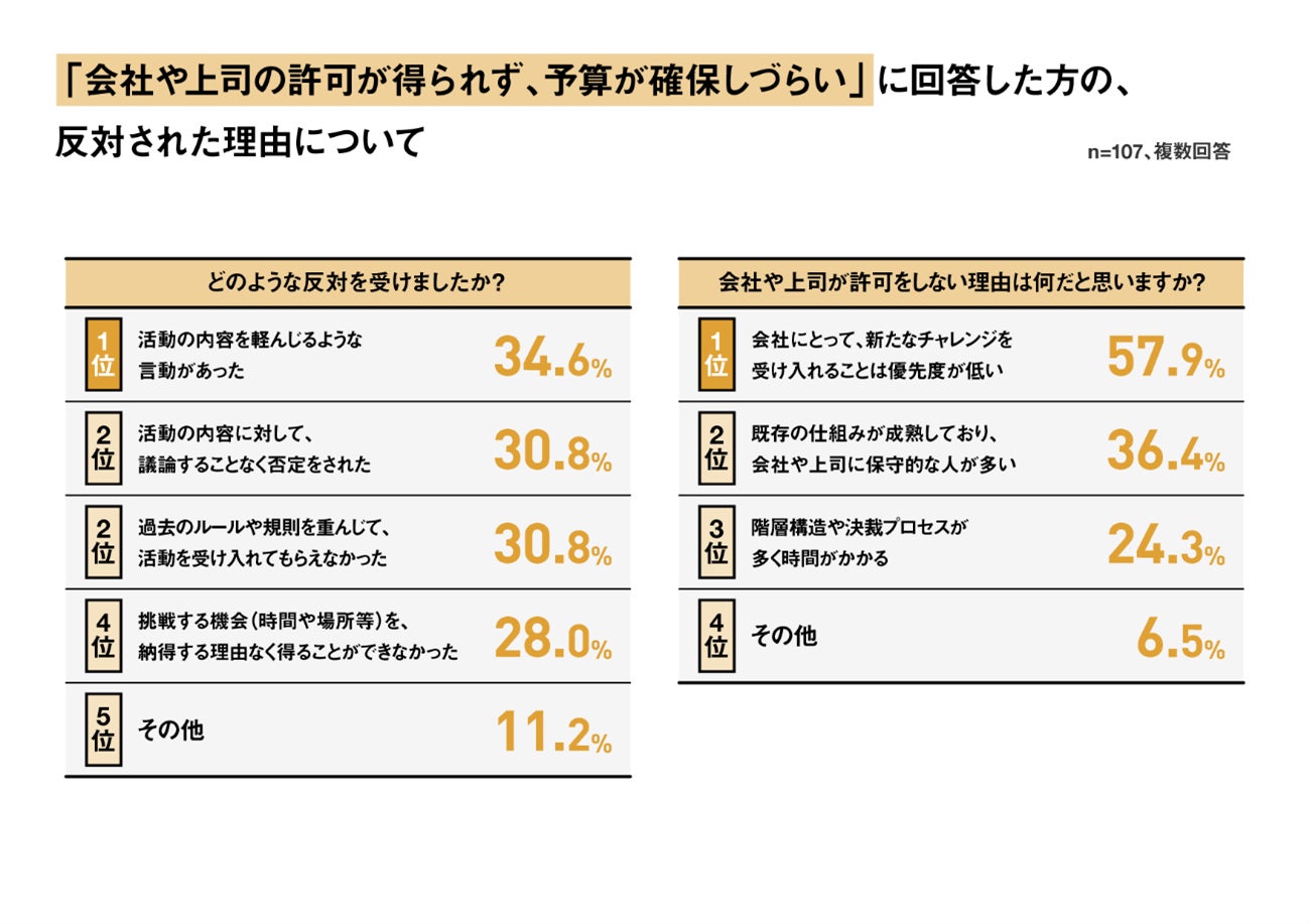 また、会社や上司が許可をしない理由として、「会社にとって、新たなチャレンジを受け入れることは優先度が低い」が57.9%と1位となりました。