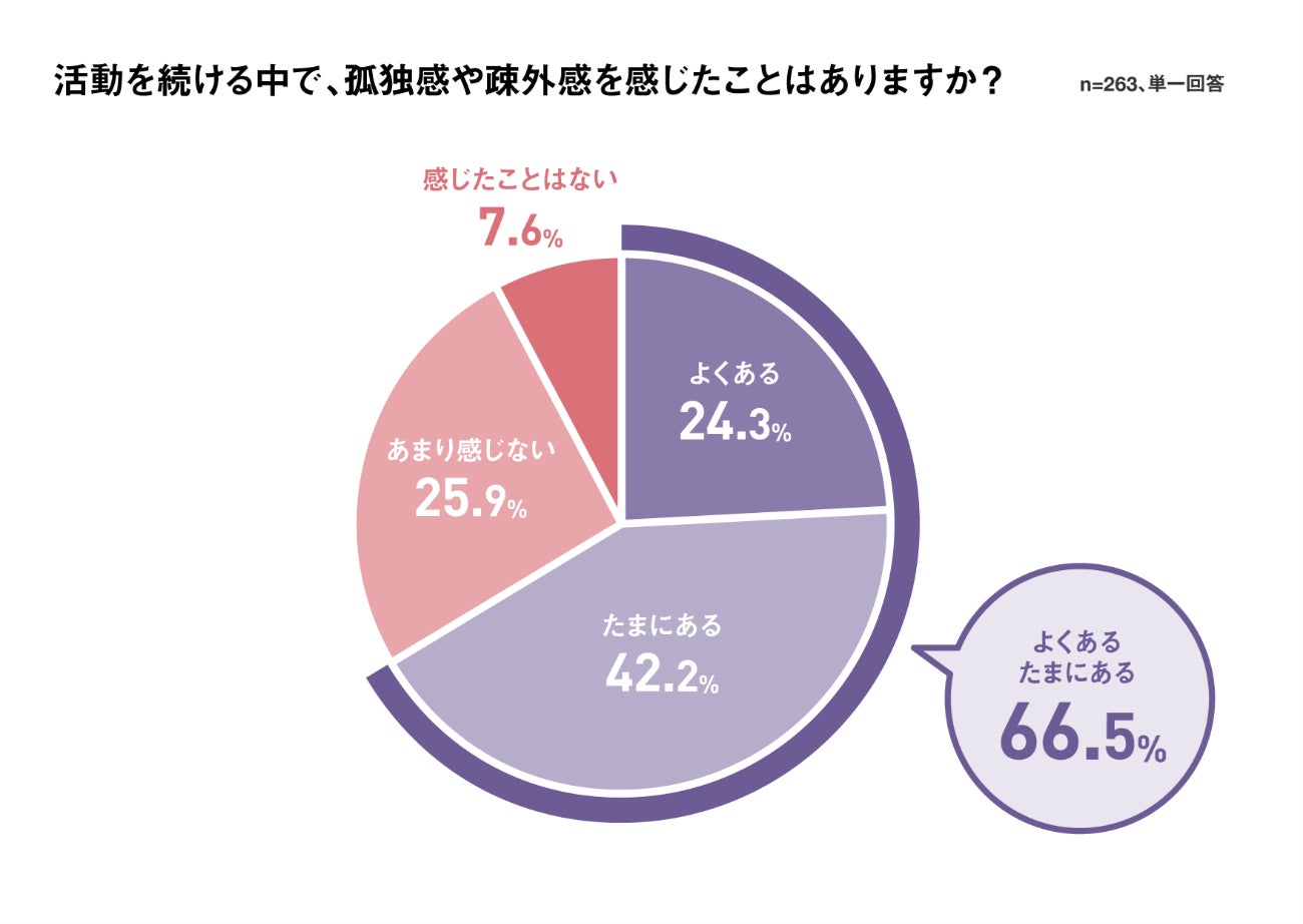 イノベーター活動を行う中で孤独感や疎外感を感じることがあるか訊いたところ、「よくある」「たまにある」合わせて66.5%の方があると回答。