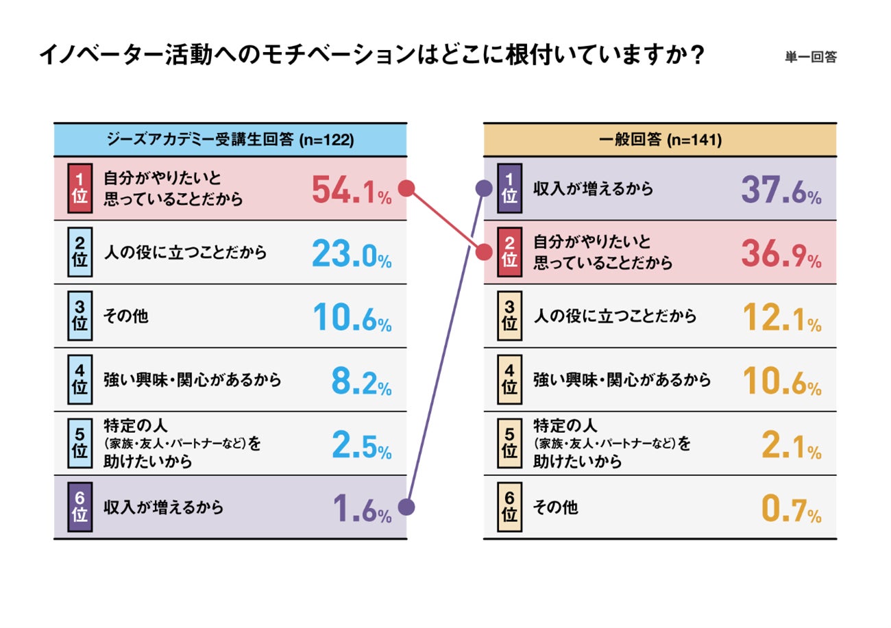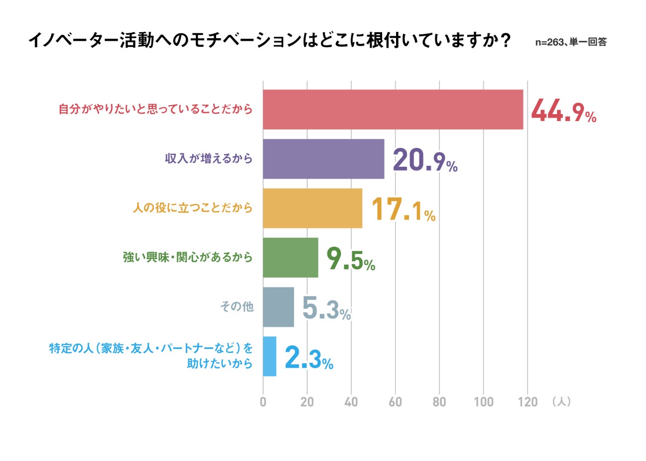 イノベーター活動を行っている方にモチベーションについて訊いたところ、「自分がやりたいと思っていることだから」が1位に。次いで、「収入が増えるから」、「人の役に立つことだから」が挙がりました。