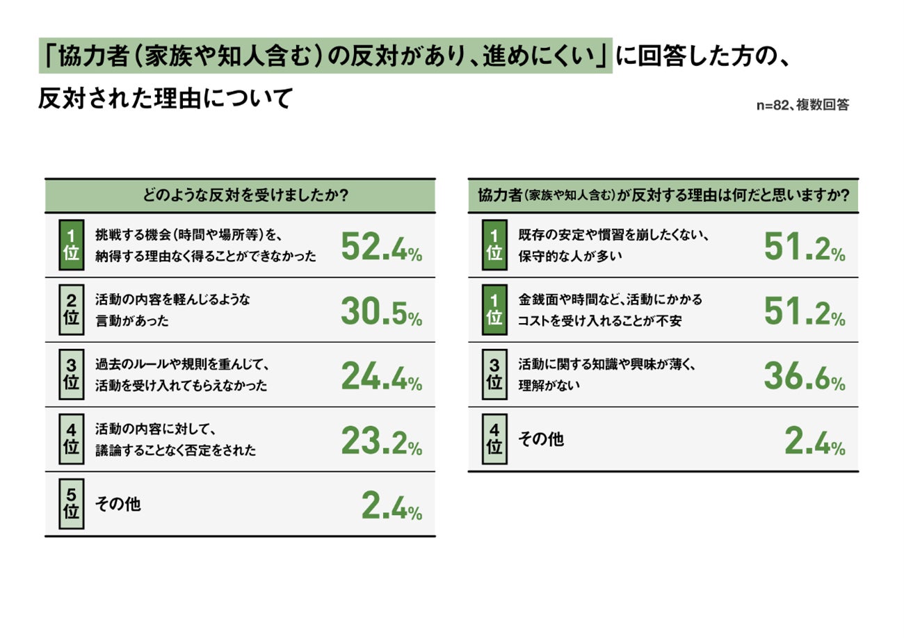 また、反対する理由としては「既存の安定した慣習を崩したくない、保守的な人が多い」「金銭面や時間など、活動にかかるコストを受け入れることが不安」が51.2%と同率で1位となりました。