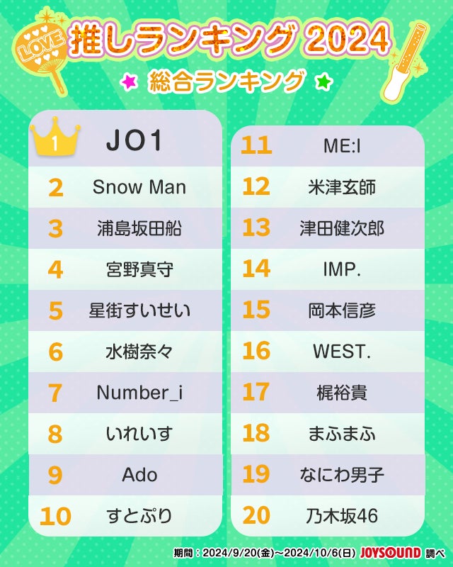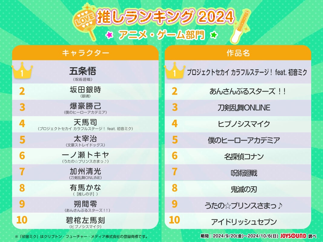 「推しランキング2024」 JOYSOUNDユーザーに今もっとも推されているアーティスト、キャラクターは!?