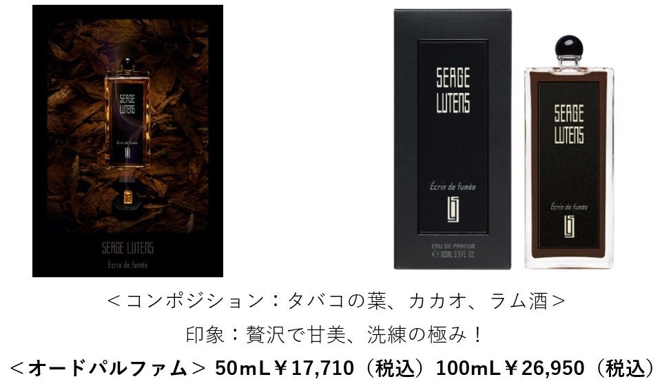 セルジュ・ルタンスのアイデンティティを凝縮したコレクション「コレクションノワール」から、今秋、官能的で温かみのあるタバコの葉の香りをポエムに仕立て上げ新しい香りが登場しました。絢爛と退廃を行き来し、燃え上がるように自由な人生を楽しむ者たちへのオマージュです。