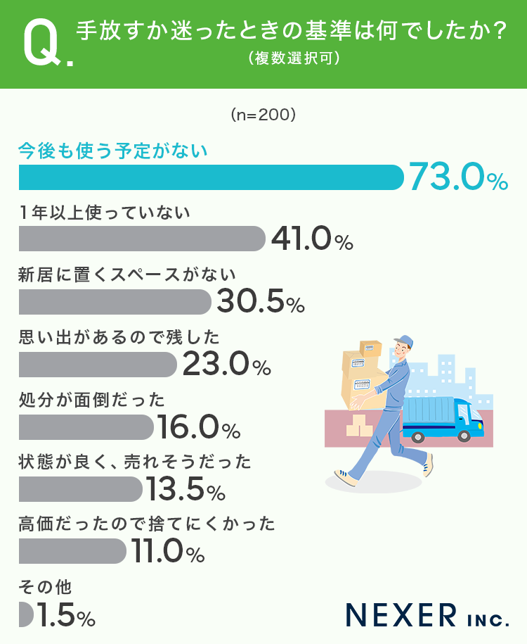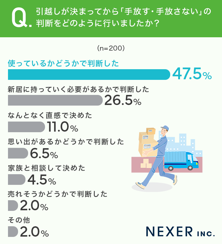 今回の調査では、引越し前の断捨離において「使っているかどうか」を最大の判断基準とする人が半数近くに上り、将来の使用見込みやスペースの有無といった現実的な視点で手放す決断を下していることがわかりました。