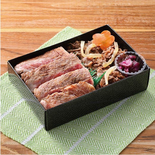松阪牛専門店より松阪牛のサーロインステーキとすき焼きを盛り付けたお弁当。松阪牛の甘みと脂の旨みを堪能できる一品。