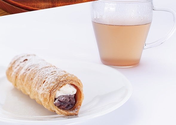 会場内で焼き上げたコルネに、自家製粒あんと和三盆クリームをたっぷり入れて仕上げる出来立てのあずきコルネ。関東では初の販売です。