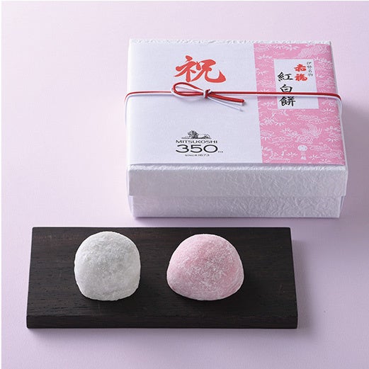 厳選したもち米と北海道小豆を使い、紅餅はこし餡、白餅はつぶ餡を包んだ特製の紅白餅。三越創業350周年限定の掛け紙でご用意しました。