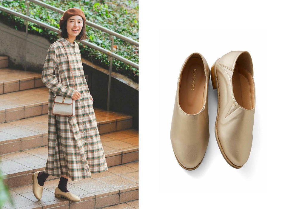 スリッポン風でありながら、きちんとした場所にも使える、らくちんさとバレエシューズの上品さを兼ね備えたシューティです。肌なじみのいいシャンパンカラーが登場しています。