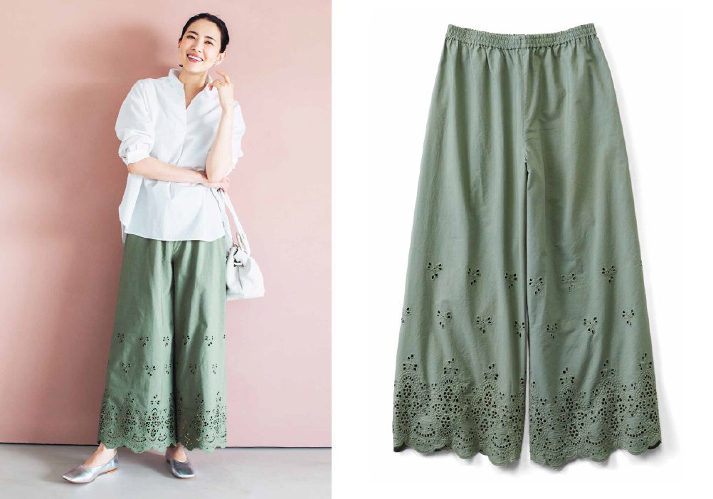 大人っぽいカットワークレースがレイヤードコーデに華を添える、大好評のレースガウチョパンツに、新色カーキが登場しています。肌なじみよく、コーデしやすいおすすめのカラーです。
