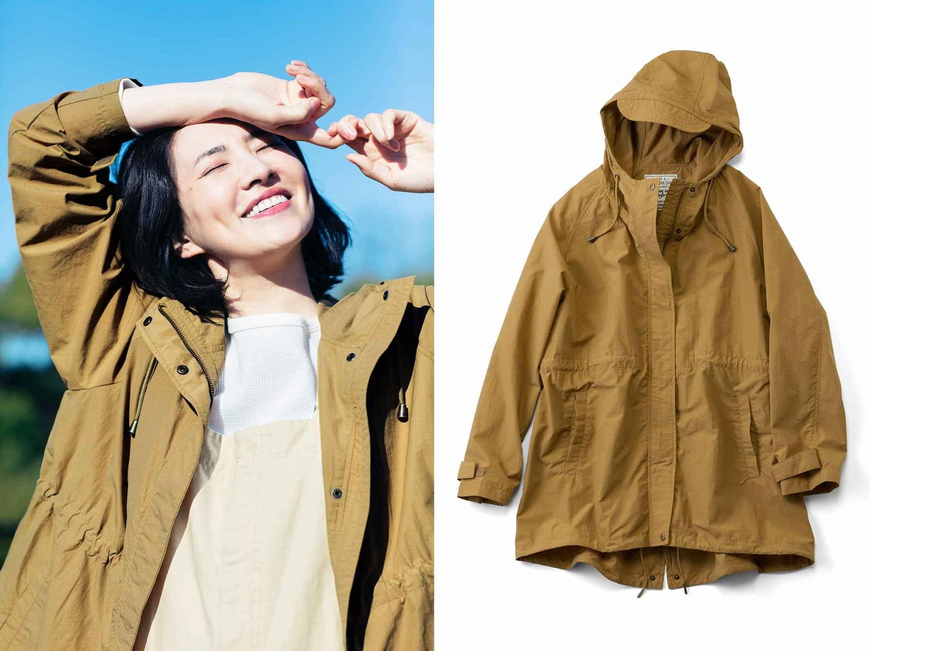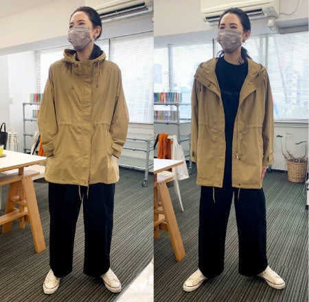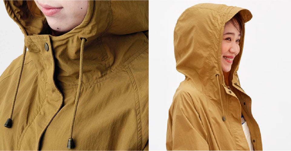 「アクティブな春に着たくなるコートを!」と、はまじさんと考えたマウンテンパーカーです。 軽さを第一に、マットな質感のスポーティーすぎない素材をセレクトしています。合わせやすいミドル丈で、シルエットは内ひもで調節もOK。買い物、散歩、レジャーなどさまざまなシチュエーションで活躍します。