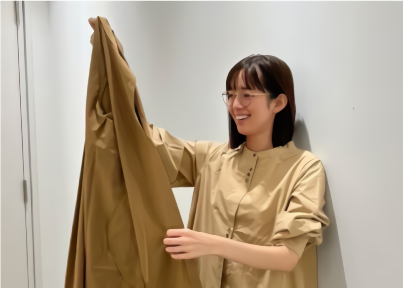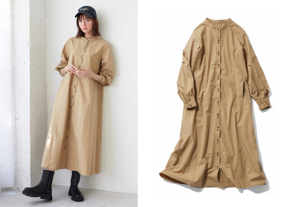 「甘めよりもカジュアルなおしゃれが好きだけど、ワンピースが着たい!って日もありますよね。そんなときシャツワンピースがちょうどいいなって思う」という栞里さんの思いが表現された一着です。「上品に着られて、歩いたときにさっそうと見えるように」と、長め丈で背中にタックを入れることで、すそに向かってボリュームが出るシルエットが特徴です。