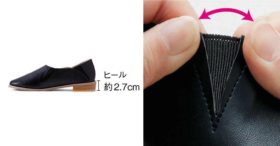 約3cmのヒールは、ペタンコ靴より歩きやすくて、足もすっきり見せてくれます。ちょっとこぎれいなスタイルにも、気負わないカジュアルスタイルにも相性抜群です。