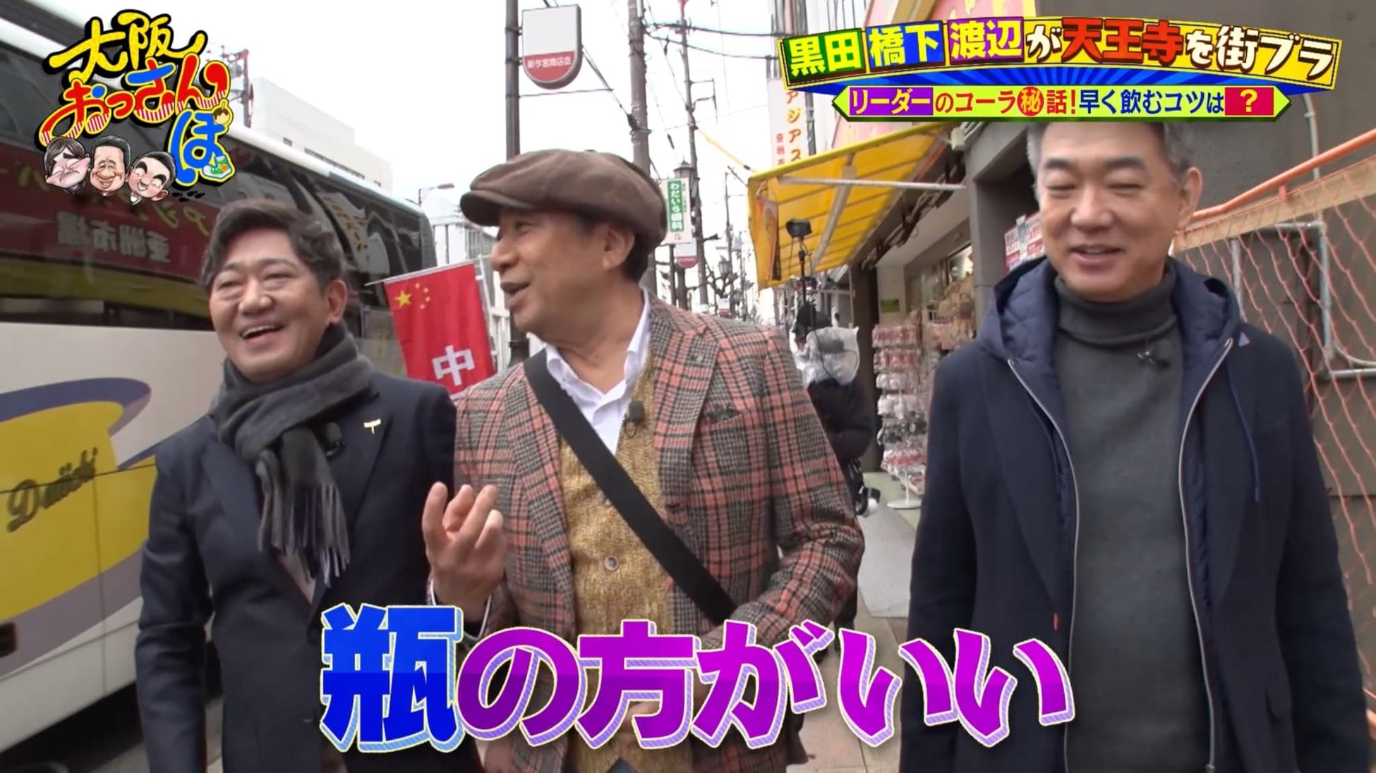 動物園を後にし、新世界へと足を延ばすおっさんたち。道中では、渡辺がかつて大人気番組『オレたちひょうきん族』で披露していた“コーラ早飲み”の秘話が話題に上がり、「実はコツがあるんですよ」と、その舞台裏を語り始める。