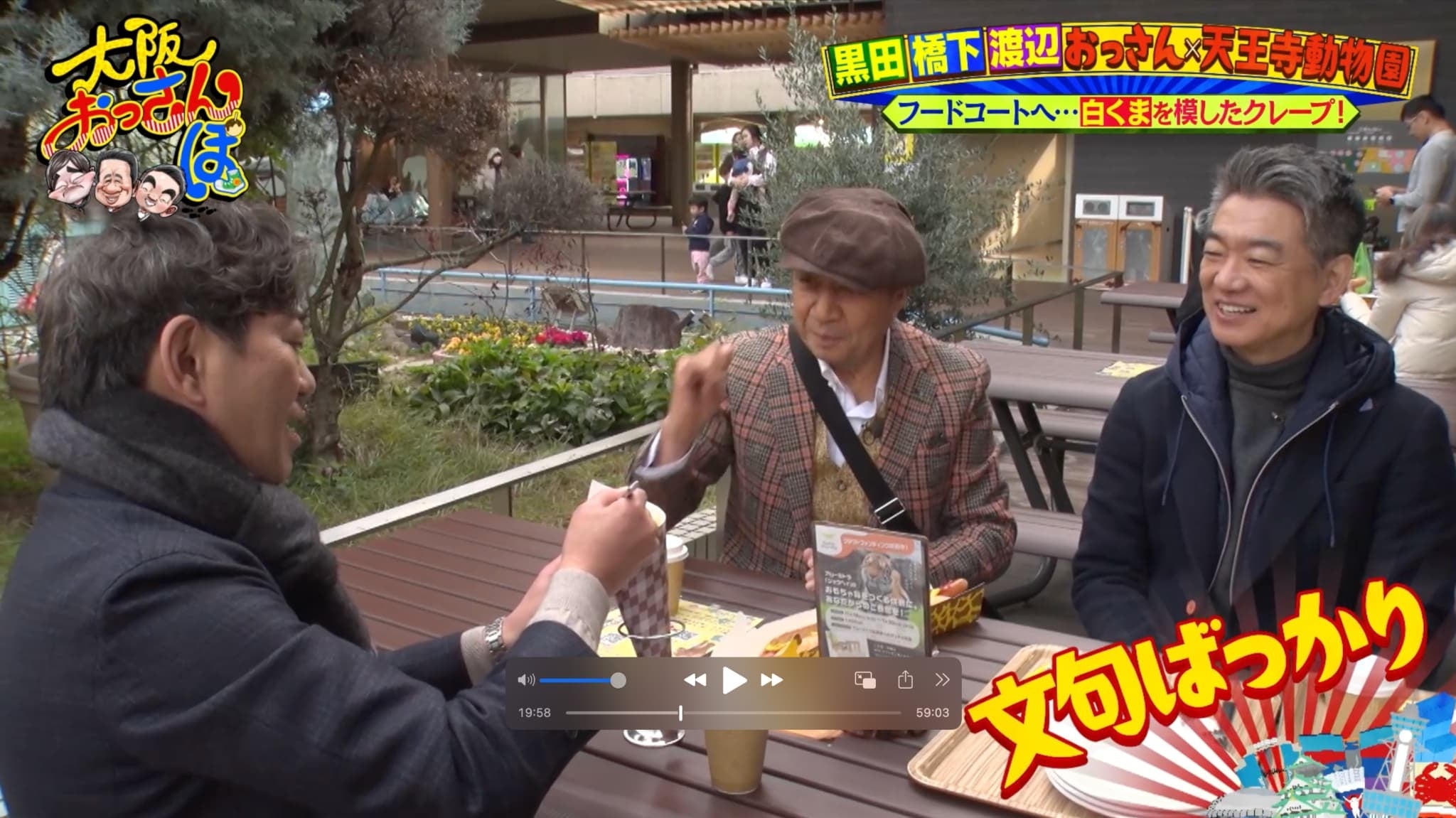 一行はフードコート「FooZoo((フーズー)」でひと休み。橋下は「しろくまクレープ」、渡辺が「きりんドッグ」と、スタッフおすすめのかわいいメニューを注文するなか、黒田はひとり「おっさんが食べるもんちゃいまっせ」とブツクサ。