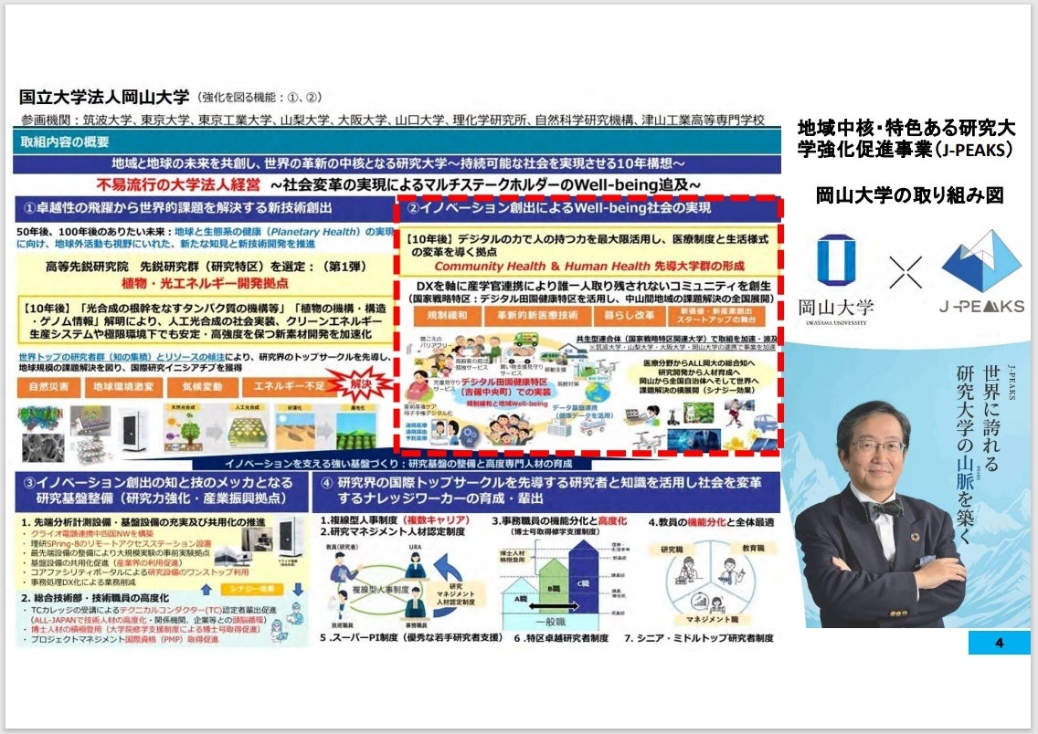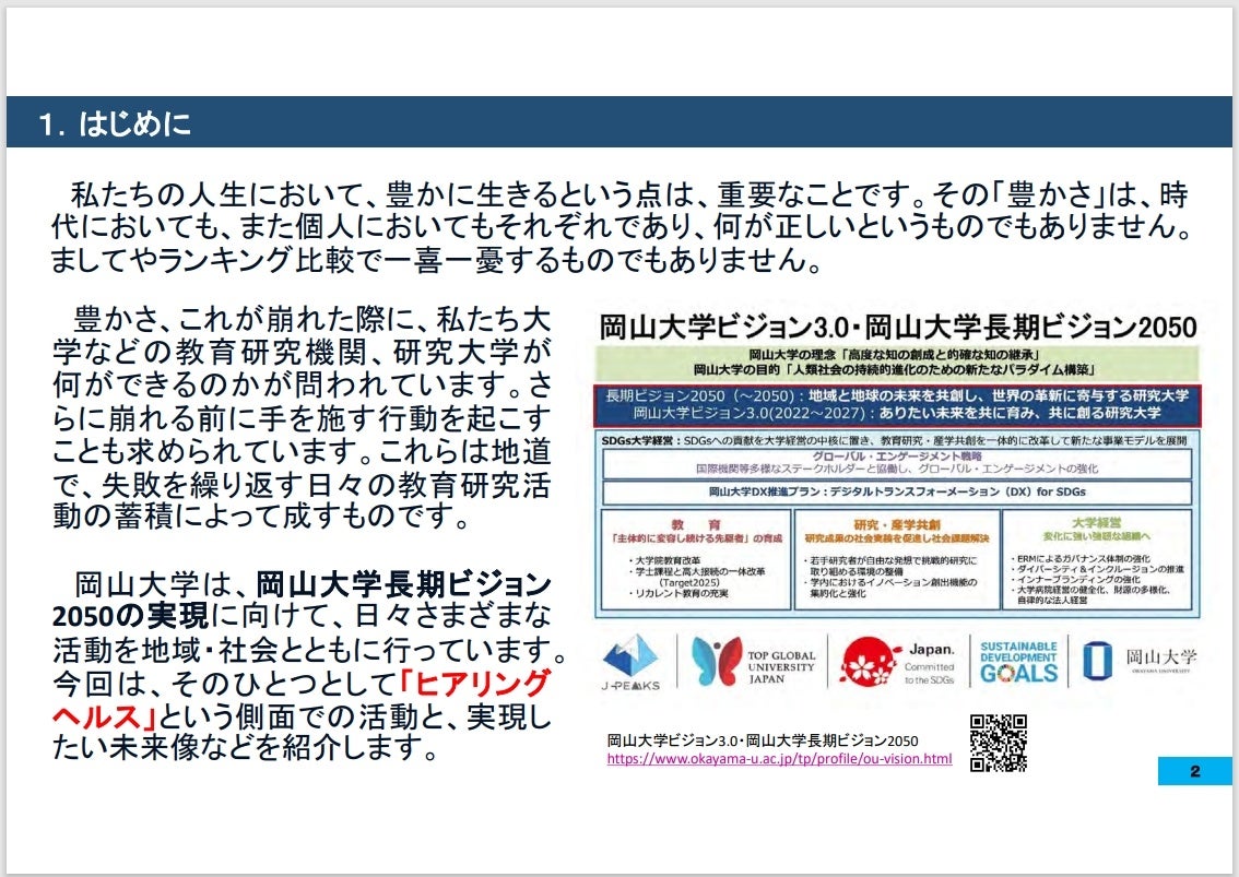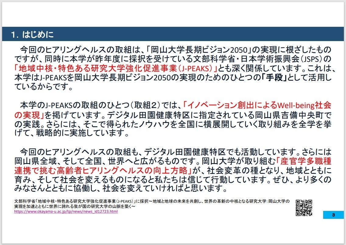 ヒアリングヘルスの取組は、「岡山大学長期ビジョン2050」の実現に根ざしたものですが、同時に岡山大学が昨年度に採択を受けている文部科学省・日本学術振興会(JSPS)の 「地域中核・特色ある研究大学強化促進事業(J-PEAKS)」とも深く関係しています。