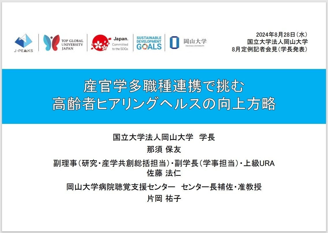 国立大学法人岡山大学(本部:岡山市北区、学長:那須保友)は、2024年8月28日(水)の2024年度8月定例記者会見の学長発表において「産官学多職種連携で挑む高齢者ヒアリングヘルスの向上方略」を発表しました。