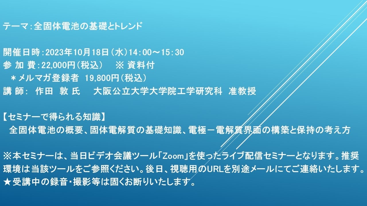 【ライブ配信セミナー】全固体電池の基礎とトレンド 10月18日(水)開催 主催:(株)シーエムシー・リサーチ