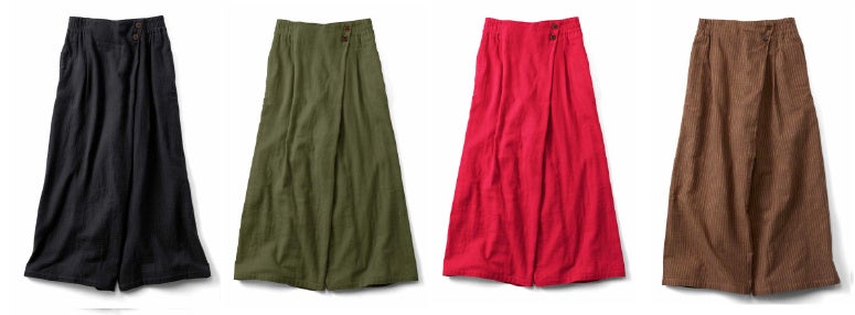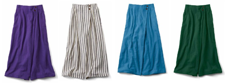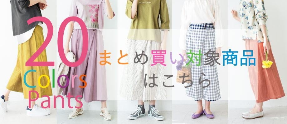 20年間ありがとうの気持ちが込められた、ダブルガーゼを用いた色とりどりのパンツです。トップスを選ばないシンプルなデザインをベースに、飾りボタン&フロントが斜めに重なるテクニックで着映え感とおなかまわりをすっきりカバーする仕様になっています。