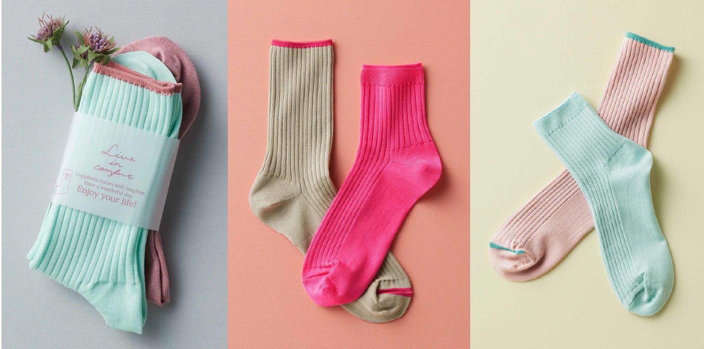 20周年を彩るもうひとつの商品は、20色の華やかなソックスセットです。差し色になる短め丈と、ボトムスからさり気なくのぞくバイカラーがポイントのクルー丈の2色をセットになっています。綿を主にした肌ざわりのいい糸にシルケット加工をほどこし、絹のような光沢と滑らかさを出しています。