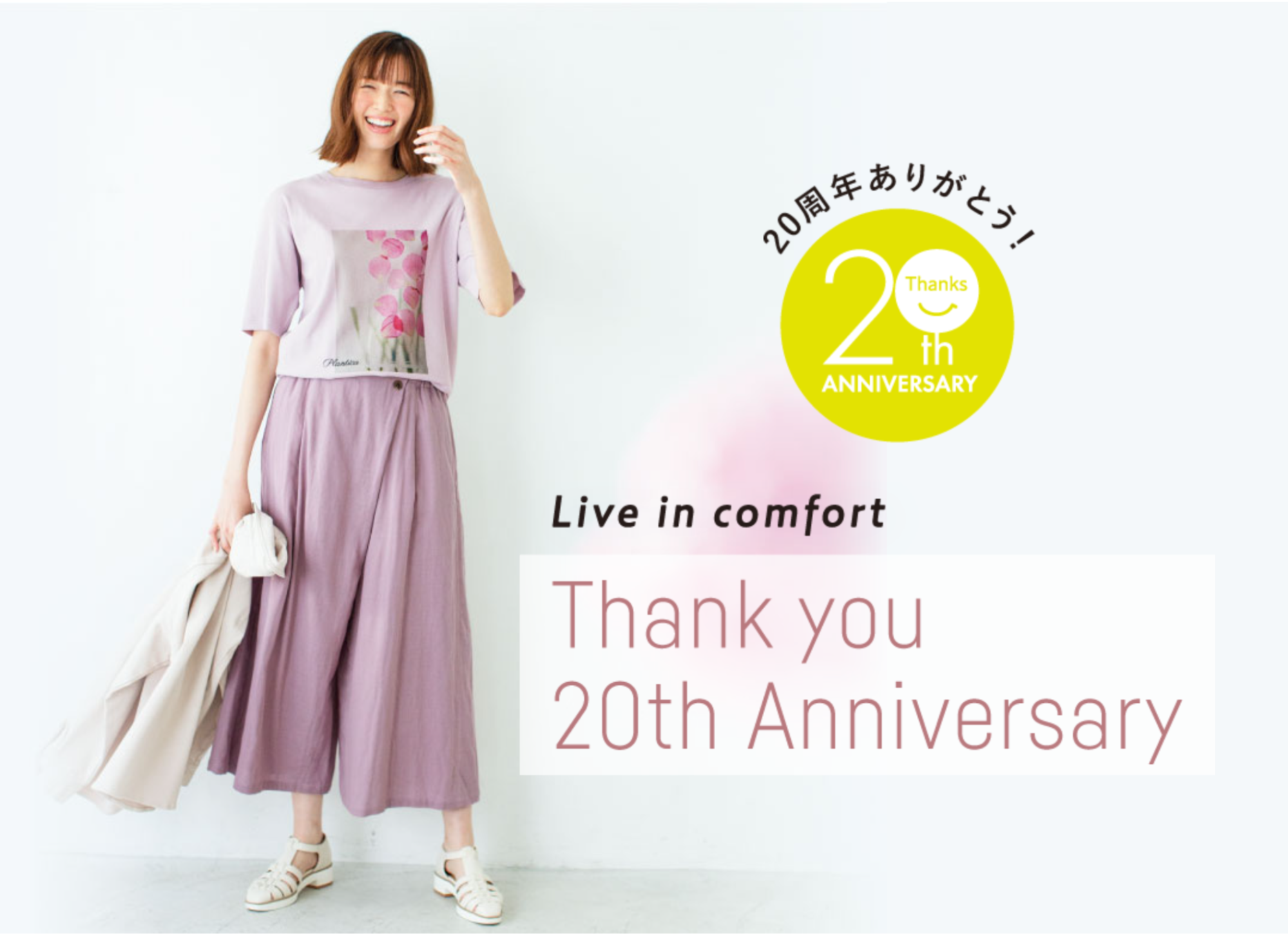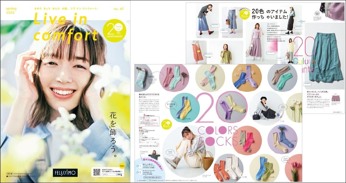 フェリシモが展開するファッションブランド「Live in comfort」は、2022年で20周年を迎え、周年記念アイテムをはじめとした春の新作を発表、3月7日より特集ページを公開し新アイテムのウェブ販売を行っています。新作のダブルガーゼの「前重なりパンツ」、「シルケットコットンのソックス」は色とりどりな20色の、365日ワクワクできるような記念アイテムです。新作は公式サイトのほか、デジタルカタログでもチェックできます。