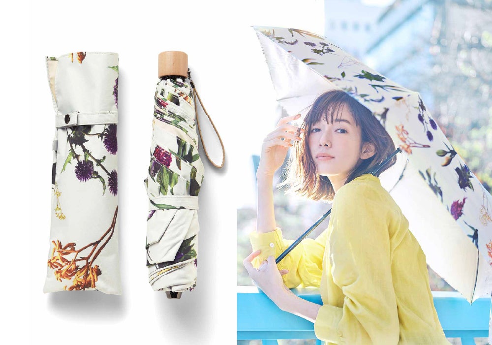 シズル感たっぷりのフォトプリントで表現された、みずみずしい香りが感じられる生花模様の傘です。晴雨兼用タイプで、たたむとコンパクトに収納できるサイズです。パープルやディープレッドなど、華やかながら甘さをおさえた大人っぽい彩りに、木製の持ち手でナチュラルな印象になっています。
