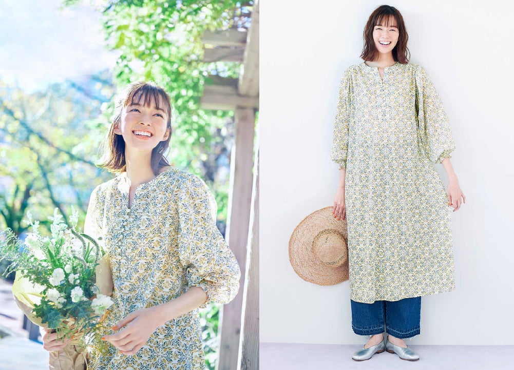 花びらや葉が組み合わさった、スペシャルなアラベスク柄のワンピースです。軽やかなコットン100%で、春のムードをたっぷり楽しめる一枚です。シャーリング遣いやふわりとした袖のシルエット、胸もとの小ぶりなボタンをきかせたデザインで、すぽんとかぶるだけで着映えます。