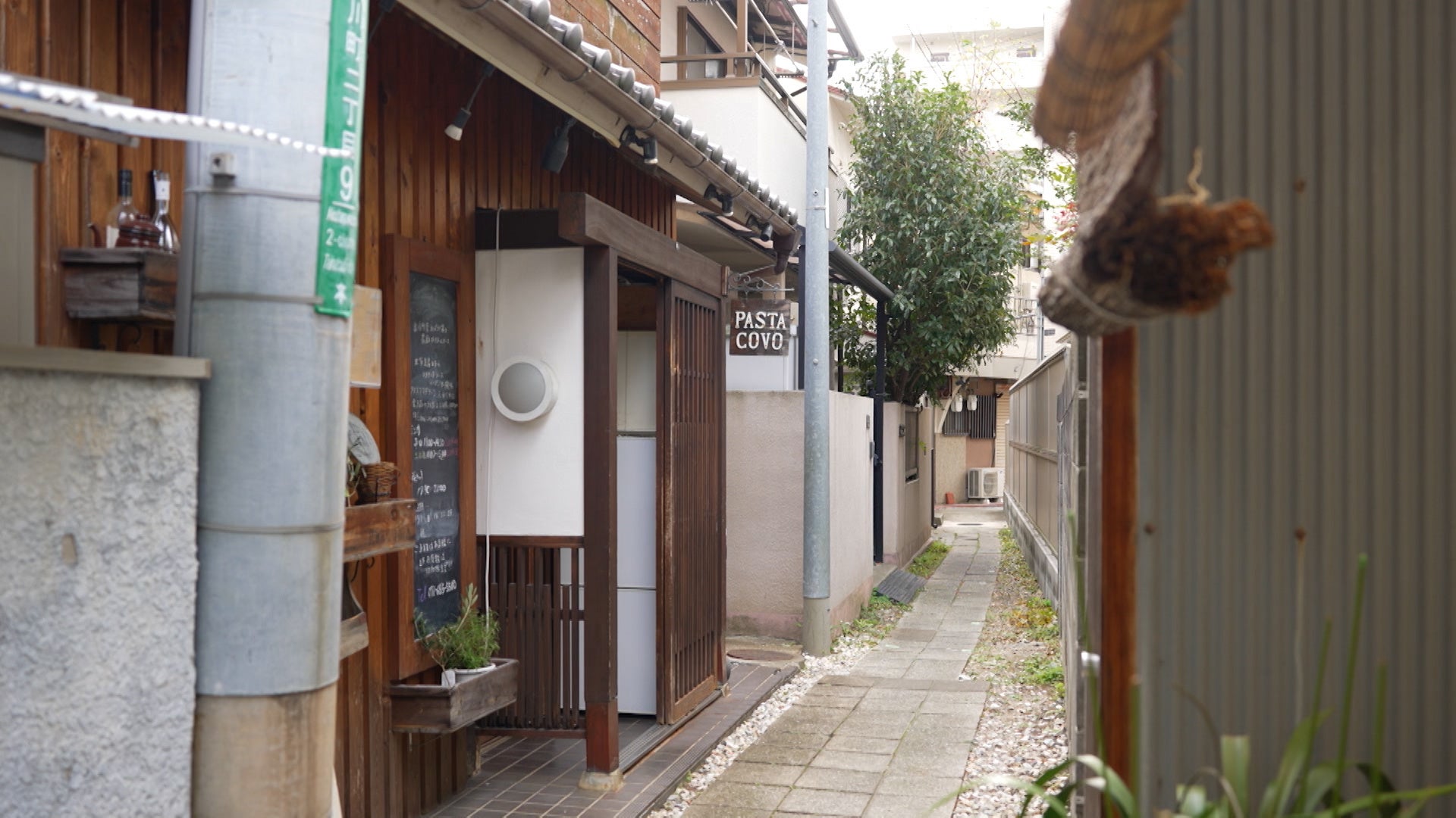 JR高槻駅前の芥川商店街から一歩外れた路地にある【PASTA COVO(パスタコーボ)】。地図を頼りに探してもなかなか見つからない…近所の人に助けられてようやく到着!そんな見つけにくい場所にも関わらず、平日でも満席の人気店。なぜこの細路地でお店を始めたのか?そして道幅は驚きの〇〇cm!