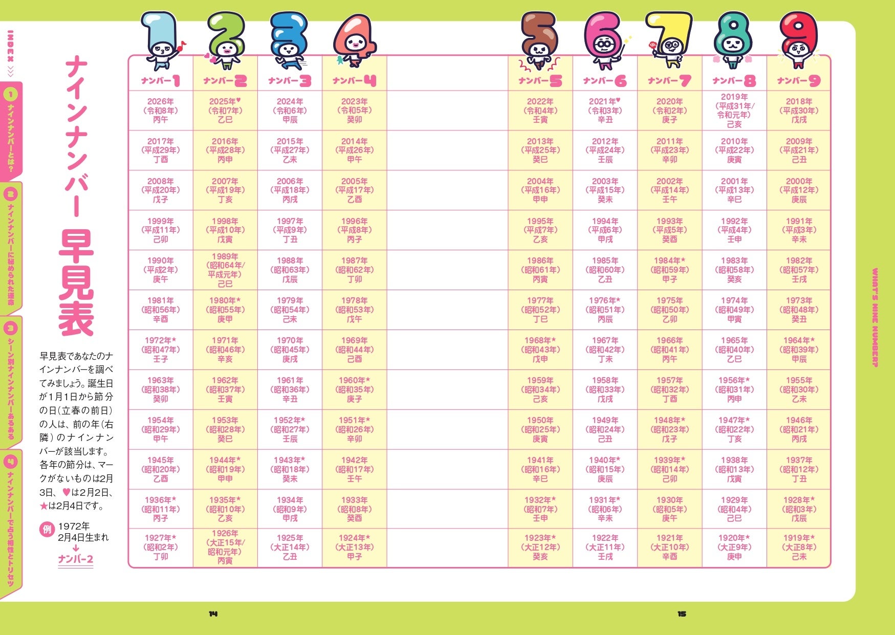 自分のナインナンバーは、こちらの早見表でわかります。誕生日が1月1日から節分までのかたは生まれ年の前年のナンバーになるのでご注意ください。