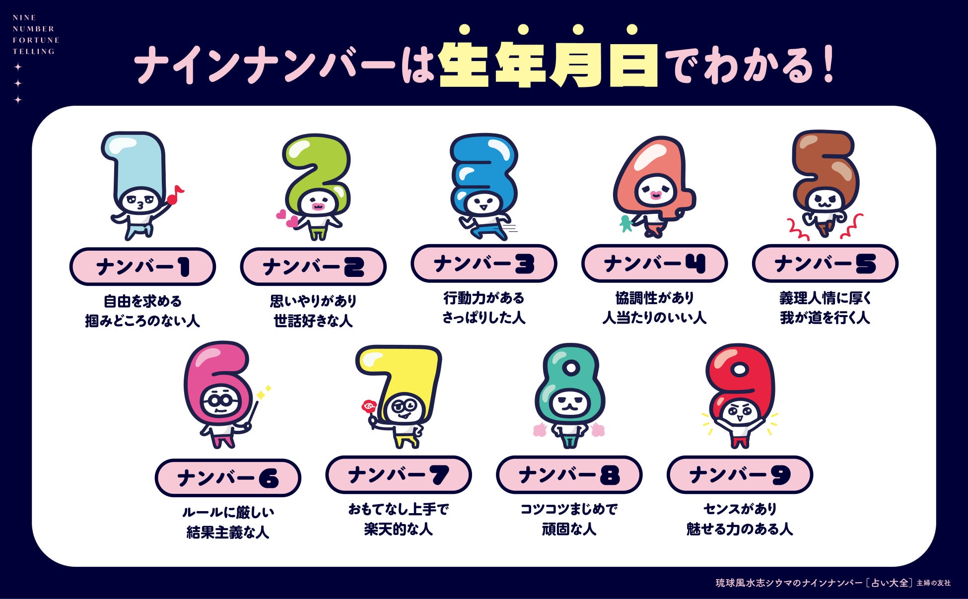 琉球風水志シウマの「ナインナンバー」は九星気学をベースに編み出した鑑定法で、生年月日によって「ナンバー1」から「ナンバー9」までの9タイプに分類されます。