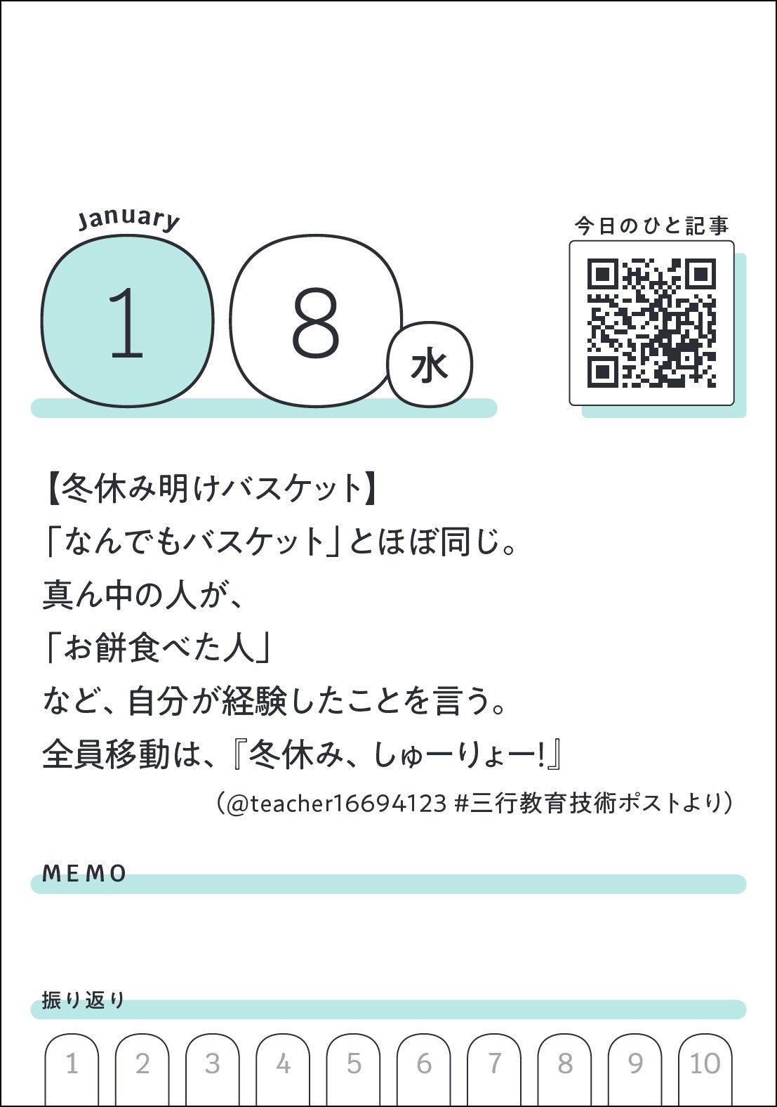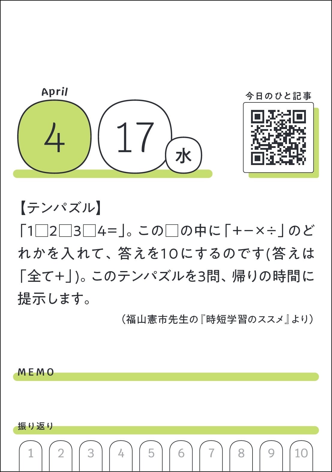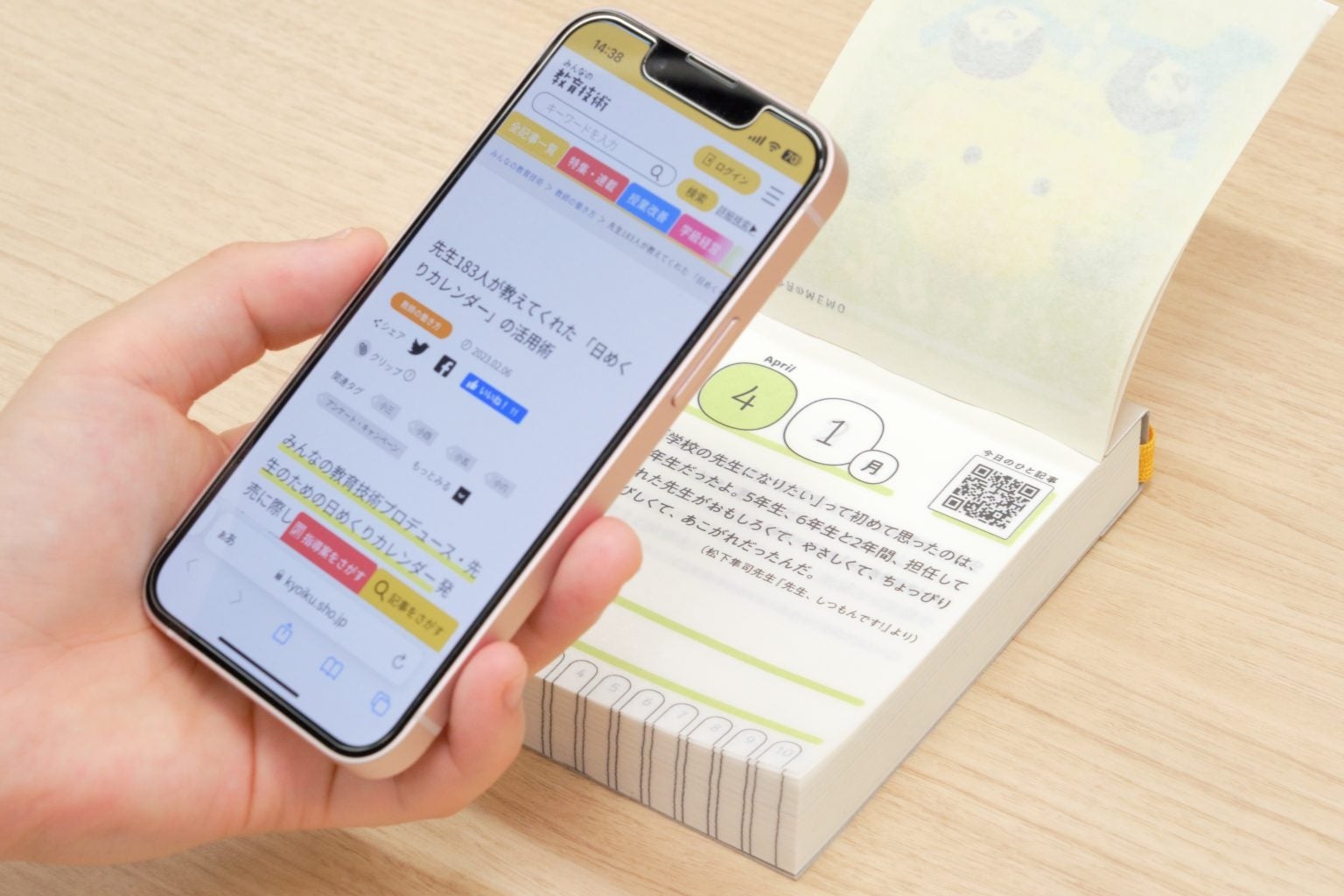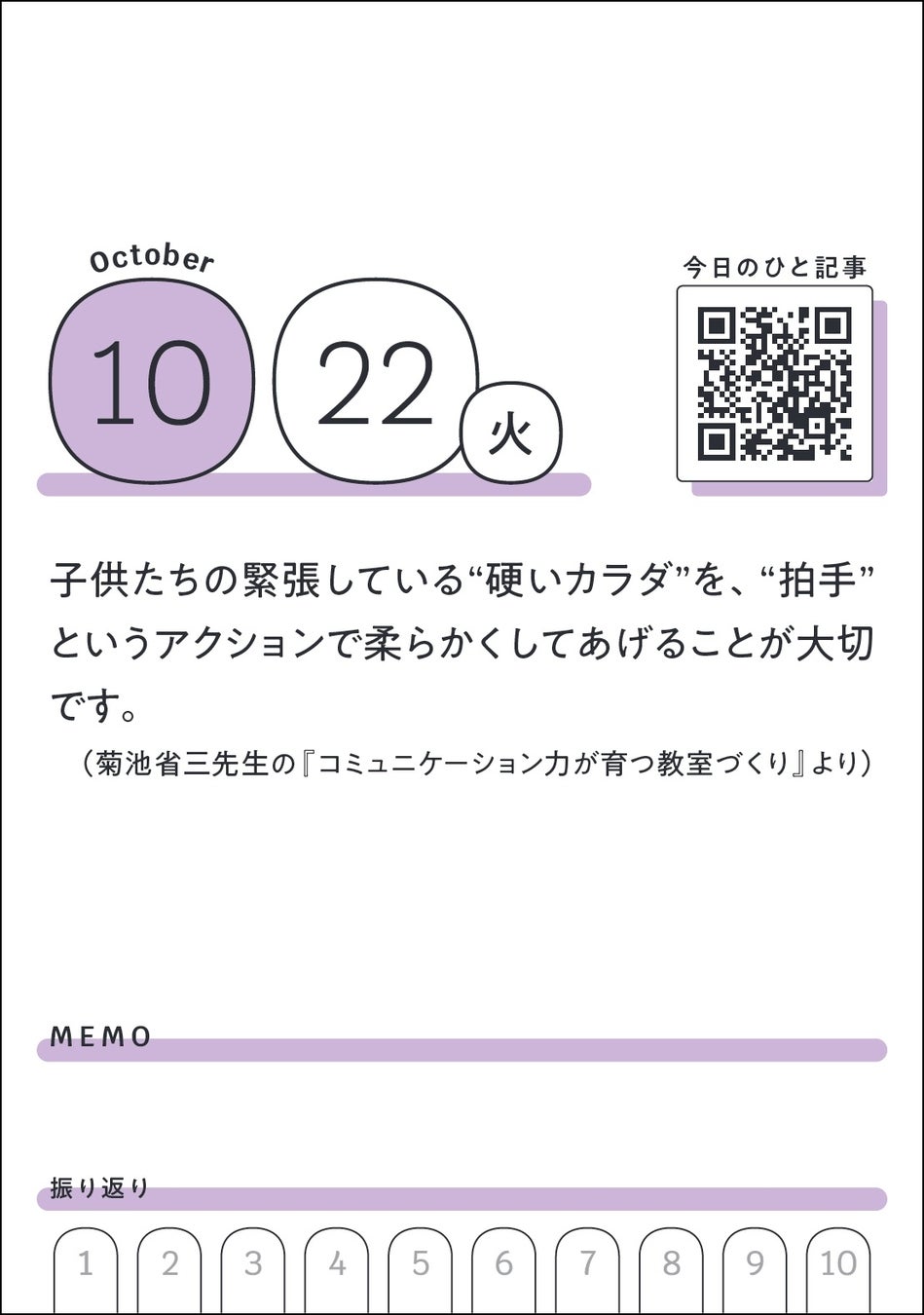 1日1枚、「みんなの教育技術」の記事などから選び抜いた前向きになれるコトバと、編集部が厳選した教育記事の二次元コードを掲載しています。
