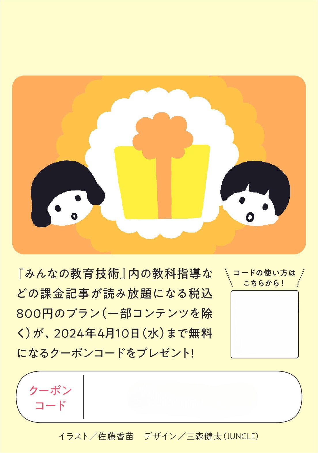 今年は、「みんなの教育技術」の教科指導アイデア記事などの有料記事が全記事読み放題になるプラン(通常800円。一部、対象外のコンテンツもあります)が無料になるクーポンコードつき(2024年4月10日まで有効)。多忙を極める春の仕事を効率的にすすめられるよう、応援しています!