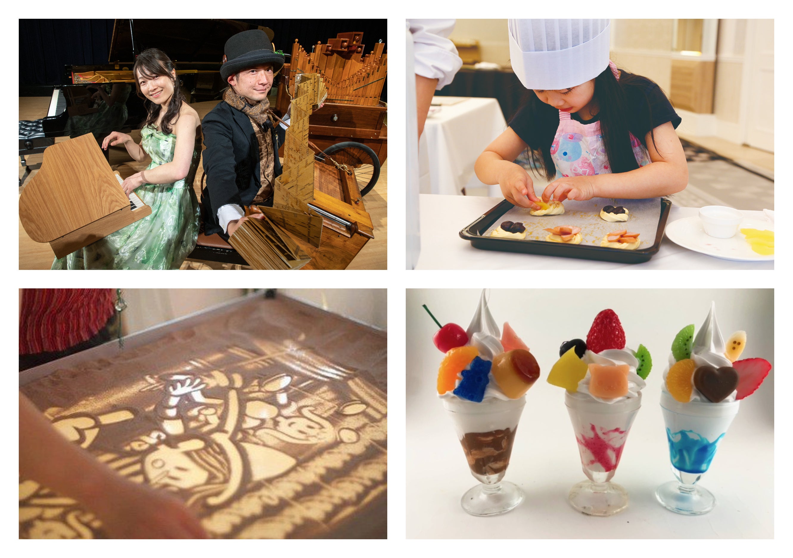 「ピアノと手回しオルガンによる、見て聴いて楽しいコンサート♪」や、音楽に合わせてリアルタイムで砂に物語を描く「サンドアート kisato」などお子さまとご一緒に観覧いただけるイベントから、可愛らしいミニパフェ(食品サンプル)を作れる「スイーツサンプル教室」や「パン作り工房」など実際に参加して体験できるイベントまで、様々な種類のお子様向けコンテンツをご用意しております。