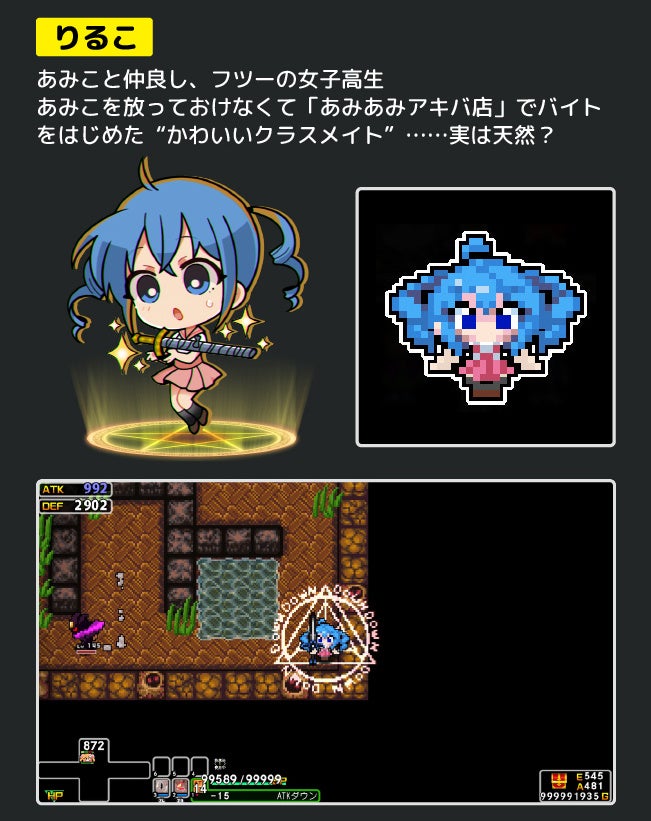 あみあみの看板娘「あみこ」、あみこと仲良しの「りるこ」、2人がバイトするお店「あみあみアキバ店」がゲーム内に登場いたします。