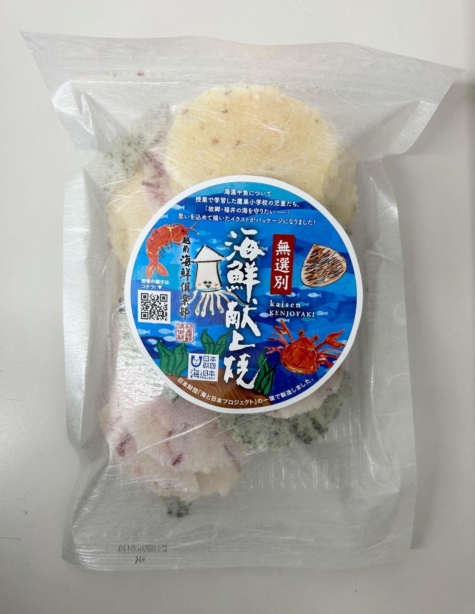 越前海鮮倶楽部は福井を代表する老舗の菓子製造販売会社です。海の資源を無駄にしたくない―。こうしたポリシーから、エビの殻や魚の骨も煎餅に使っているのが特徴。今回、子どもたちの福井の海を守りたいという思いに共感し、コラボレーション商品の開発・販売に至りました。あますことなく、海の資源をそのまま味わってほしい、決して海の恵みで無駄なものはない―。商品を手に取った方に伝えたいメッセージです。