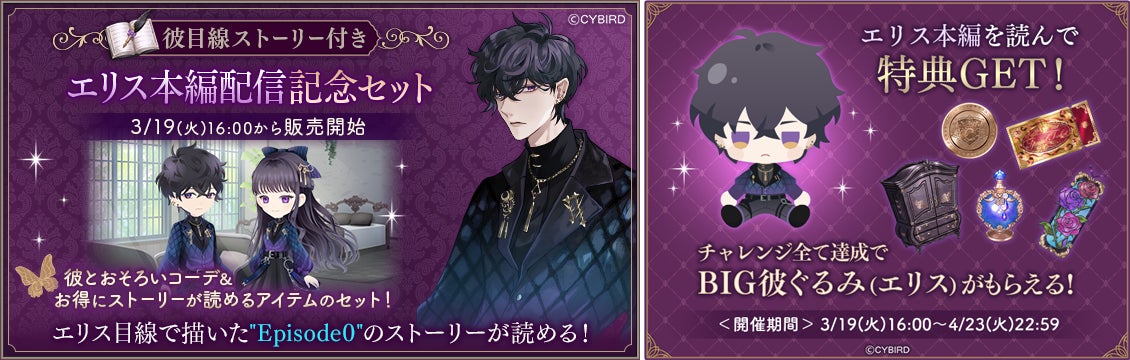 彼目線で描かれる、あなたと彼が出逢う前の「エリス本編 Episode.0」が入ったお得な本編配信記念セットと、本編を読むことに没頭できる「エリス本編没頭セット」を販売します。他にも、「BIG彼ぐるみ(エリス)」のアバターアイテムなど豪華特典が獲得できる「エリス本編おとぎ師チャレンジ」を開催しています。