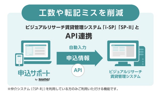 株式会社リクルート(本社:東京都千代田区、代表取締役社長:北村 吉弘、以下リクルート)が提供する不動産情報サイト『SUUMO』は、賃貸業界における不動産会社の業務効率化支援を強化するため、『申込サポートby SUUMO』において株式会社ビジュアルリサーチ(本社:東京都港区、代表取締役社長:小野 貴広、以下ビジュアルリサーチ)の賃貸管理システム(「i-SP」「SP-Ⅱ」)との申込情報のAPI連携*を2024年4月より開始しました。