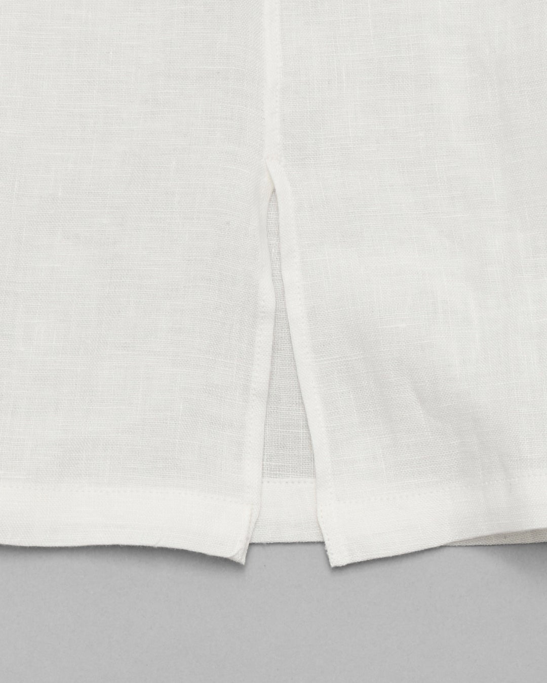 生地には、細番手でフラットなドレス生地でもなく、節の強いラフなリネンでもない、その中間に位置する風合いを採用。ほどよい甘さと自然な表情を備えています。