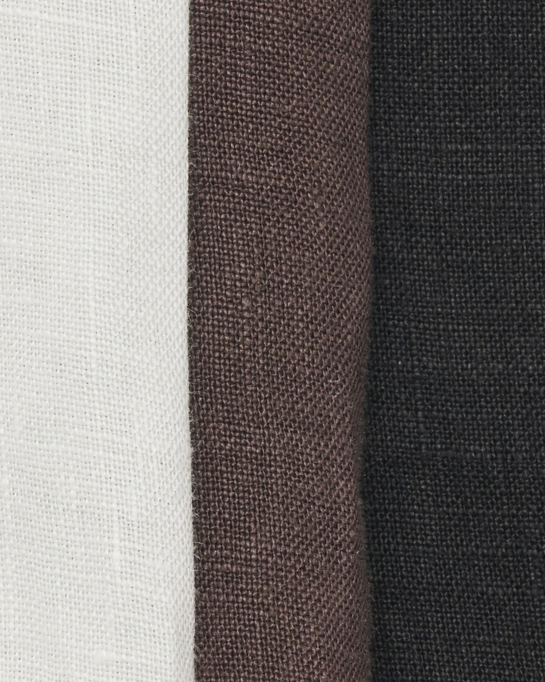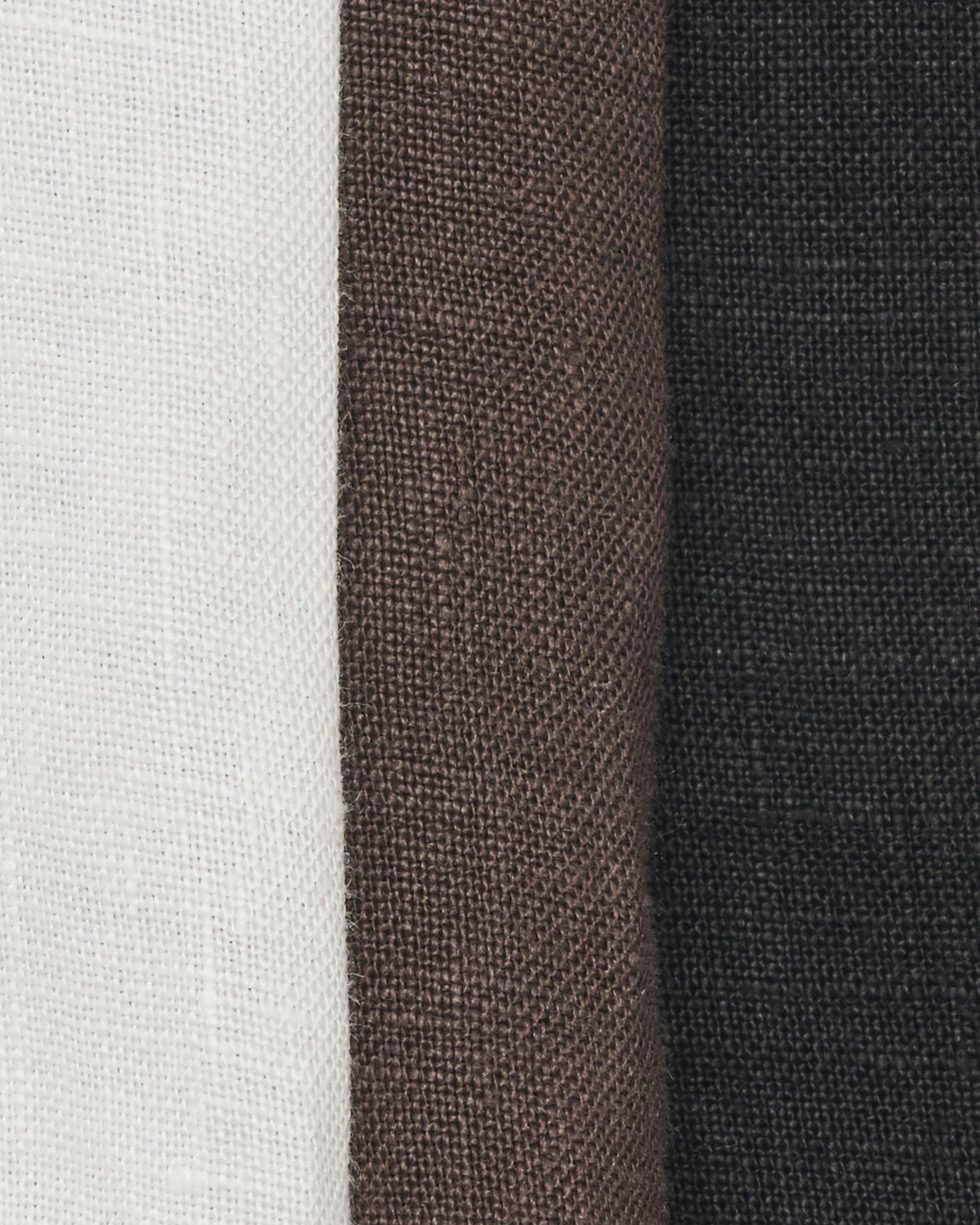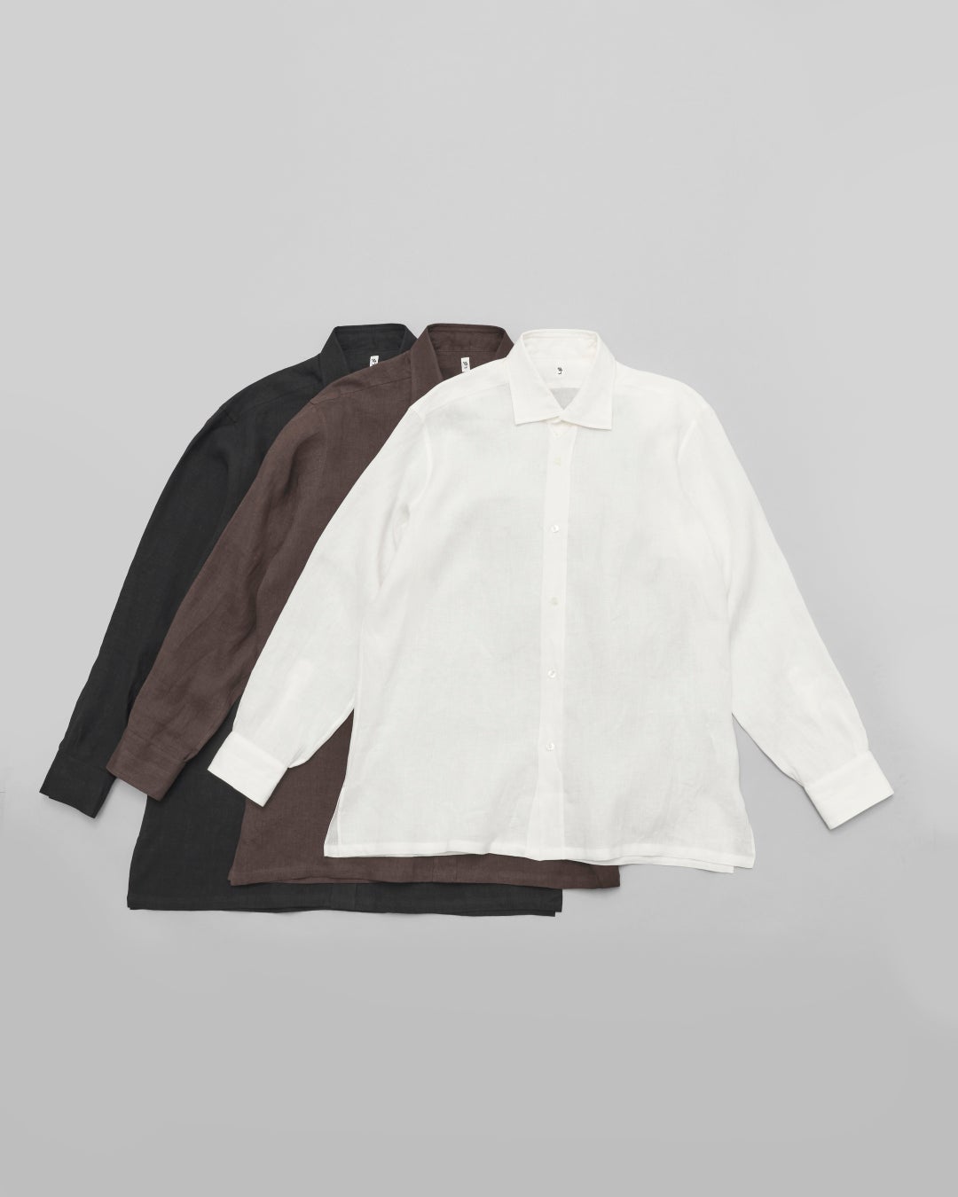 カラーはホワイト、ブラック、ブラウンの3色展開。リネン特有の光沢を抑え、落ち着いたトーンに仕上げました。サイズは9展開で、スリムには振らず、適度なゆとりを持たせています。
