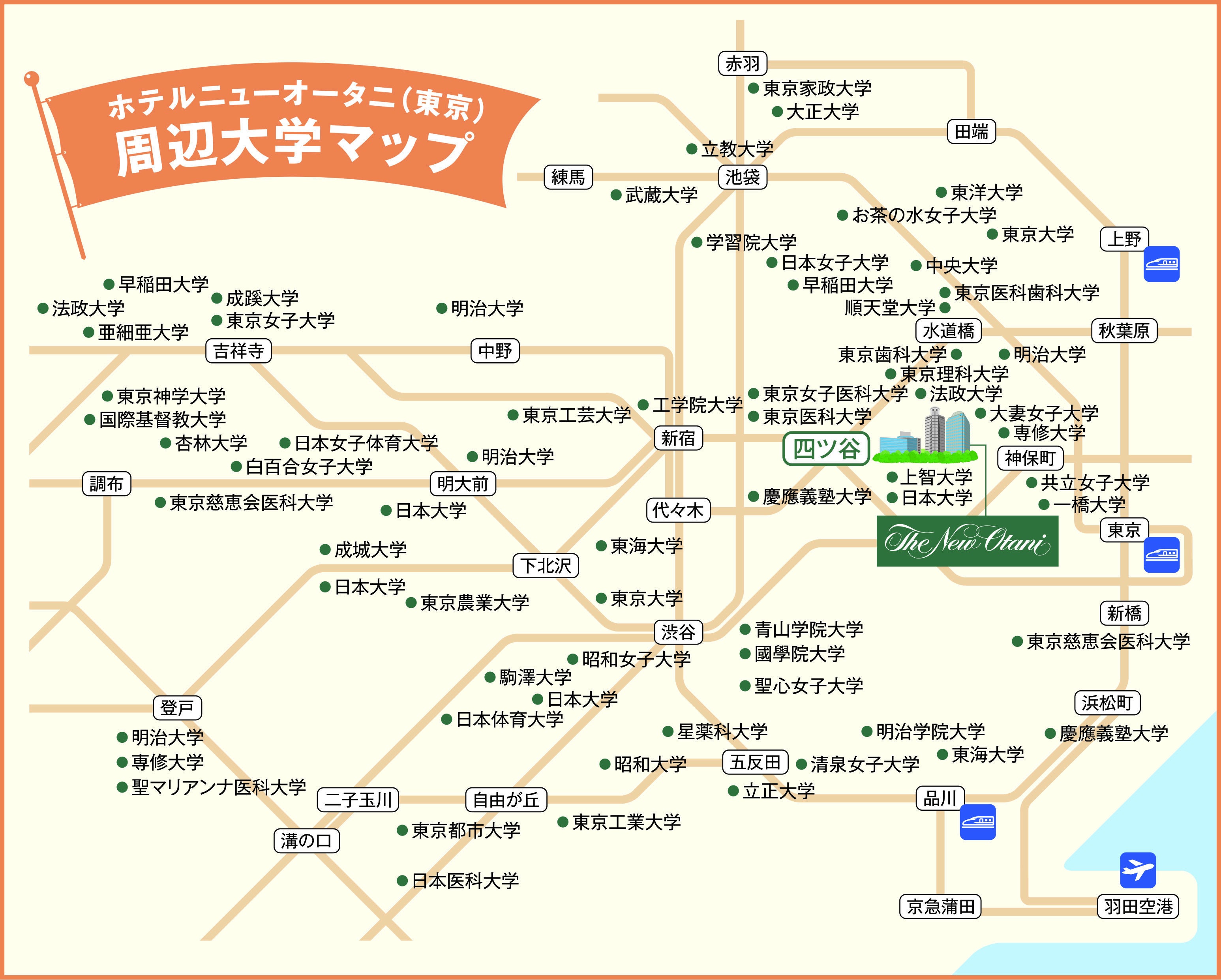 慣れない土地で迷ってしまうのに不安な方も、少しでも移動の負担を減らしたい方にも、試験会場の近くを拠点として選ぶのがおすすめ。ホテルニューオータニ(東京)は、四ツ谷駅、麹町駅、赤坂見附駅、永田町駅の4つの駅と7つの路線により、都内の各大学へ抜群のアクセスを誇ります。