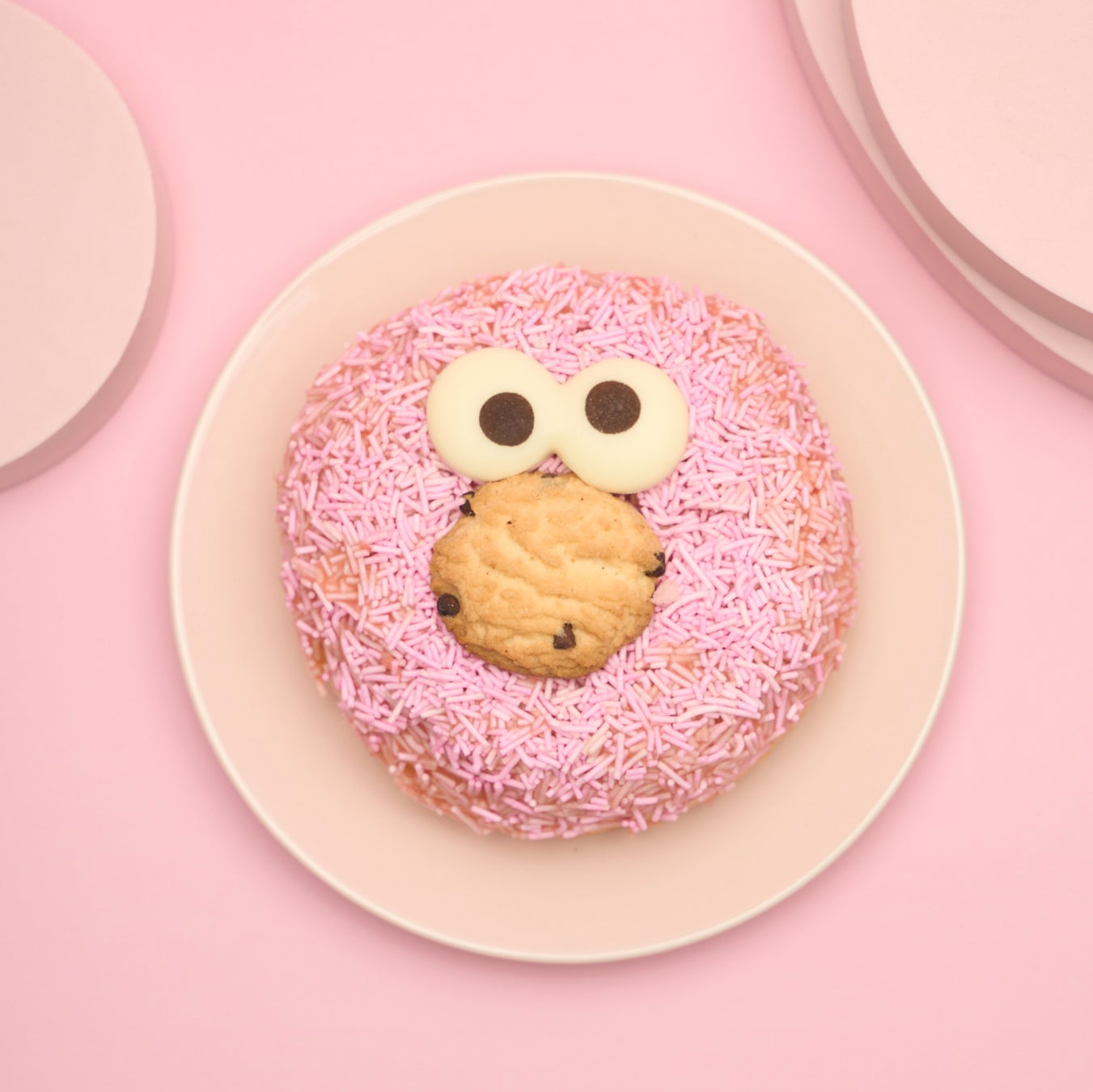 ストロベリーレモネード味のグレーズ(コーティング)に、フラミンゴピンクのスプリンクルでピンクに変身したクッキーモンスタードーナツ。