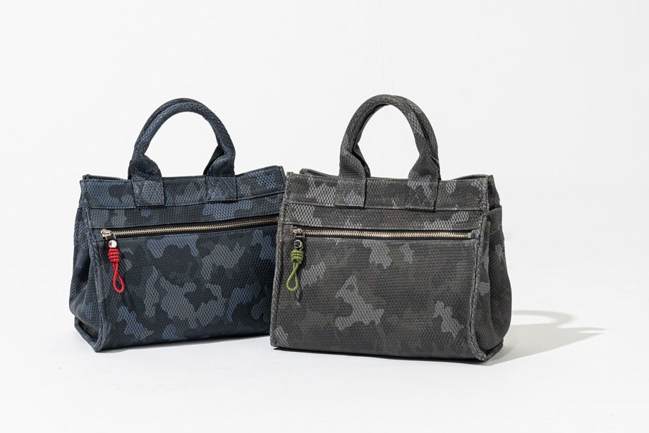 日常使いできる<MANIUNO/マニウノ>より洗練とモダンが息づくアイテムが登場。カートバッグとしても使えそうなトートは、カモフラージュ柄にパンチングを施した軽くてやわらかな<ECCO/エコー>製レザーを採用。ペットボトルの収納や、スマートフォンの持ち歩きにちょうどいいポケットを備えるなど機能性も上々。引き手にはエルサルバドルのフェアトレードで作られたチャームが付属。