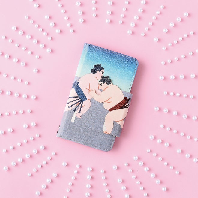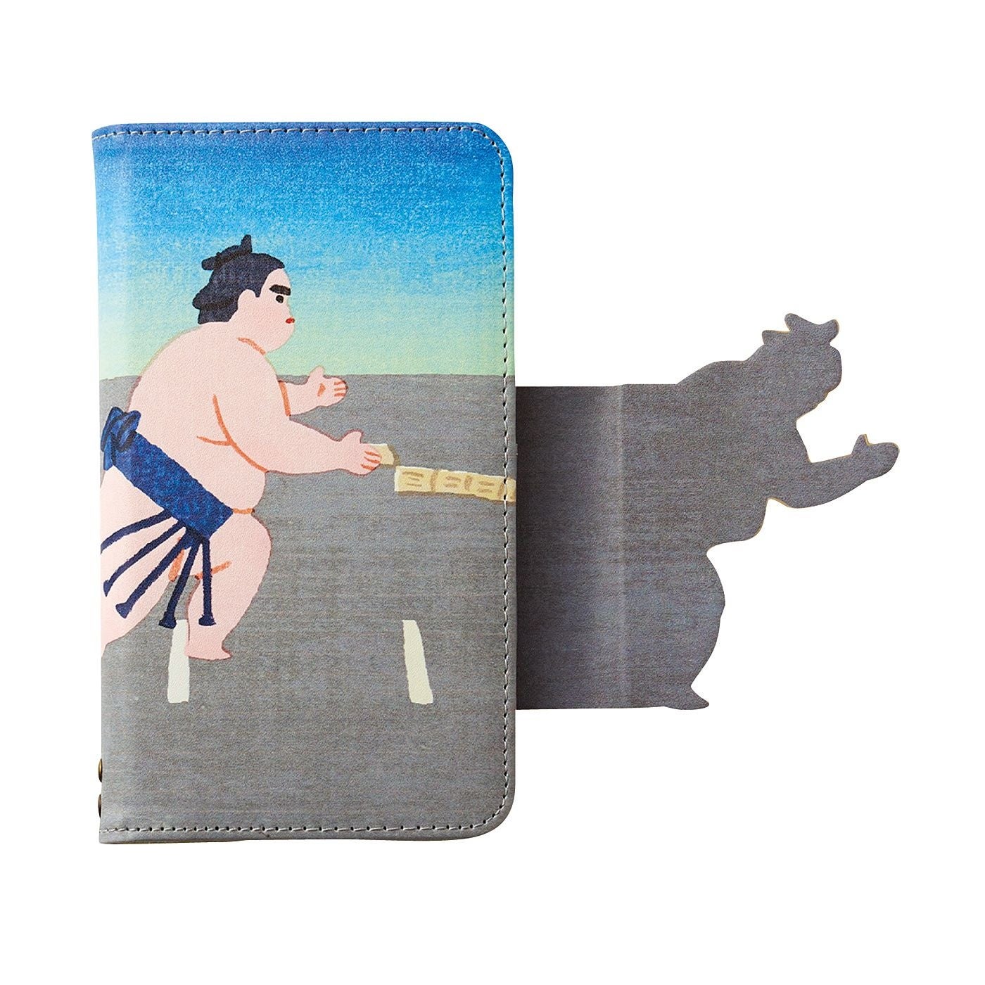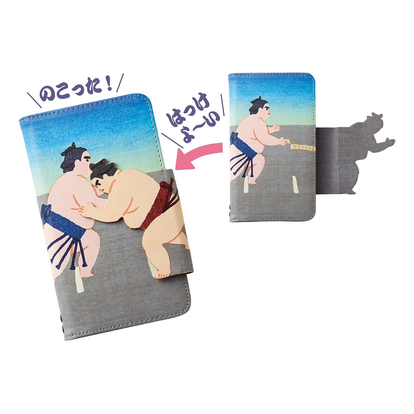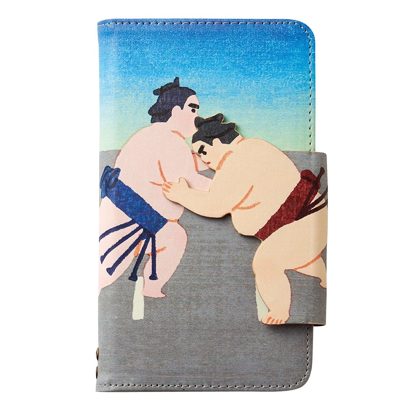 スマホケースを開け閉めするたびに「はっけよい、のこった!」と力士がぶつかり合うデザインです。裏面には勝負を見守る行司の姿もあります。