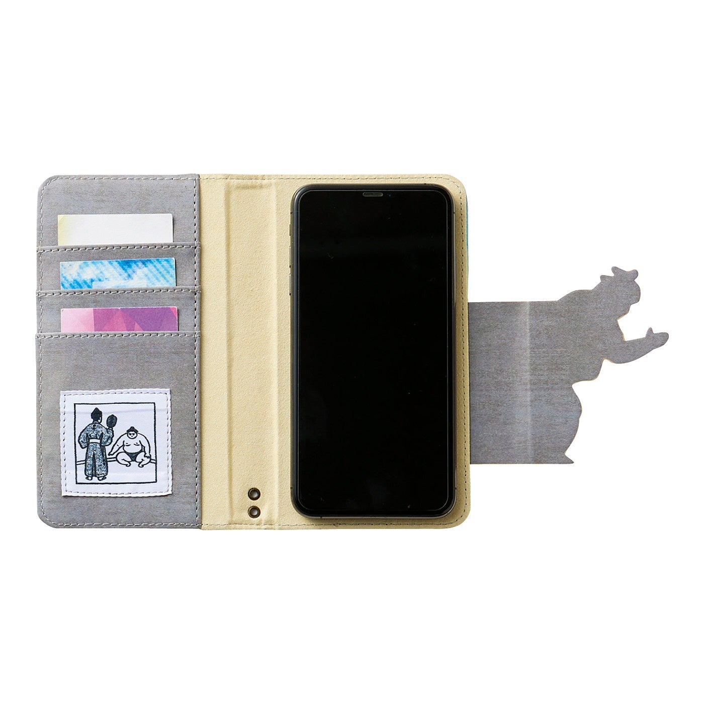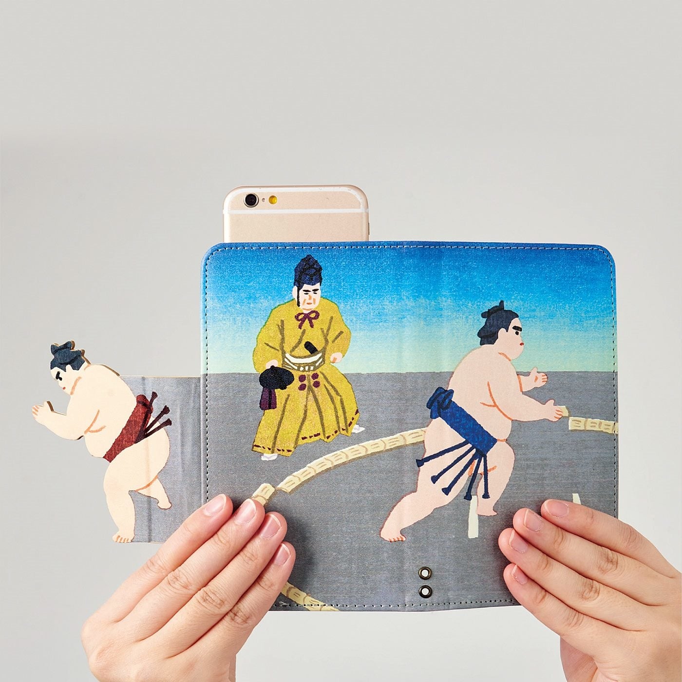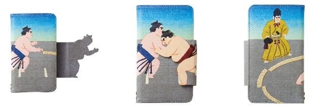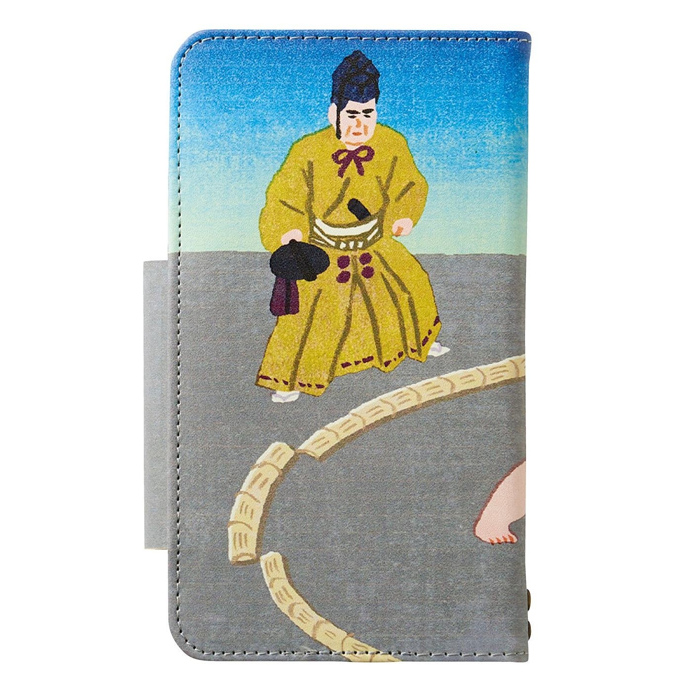 スマホケースを開け閉めするたびに「はっけよい、のこった!」と力士がぶつかり合うデザインです。裏面には勝負を見守る行司の姿もあります。