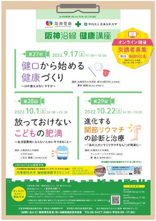 阪神電気鉄道株式会社(本社:大阪市福島区、社長:秦 雅夫)と学校法人兵庫医科大学(法人本部:兵庫県西宮市、理事長:太城 力良)は、沿線住民の健康増進による沿線活性化を目的に、2015年から医療の最前線で活躍する医師がそれぞれの専門領域のテーマについて説明する「阪神沿線健康講座」を開催しています。この度の第27~29回の開催回では、9月と10月の3日間、「医学の進歩と日頃の予防・治療で『病気から身体を守る』」をテーマに、オンラインで兵庫医科大学病院の医師がわかりやすく解説します。参加費は無料です。