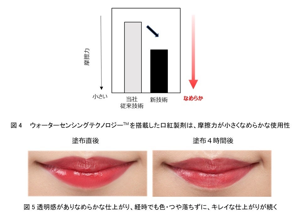 口紅の摩擦力を専用の機器で測定すると、新技術搭載の口紅の方が摩擦力が小さく、唇への負荷が少なく、なめらかな塗り心地を実現していることがわかりました(図4)。本基剤を使用した際の仕上がりを観察すると、塗布後、普段通りに過ごした4時間後においても、色・つやともに維持され、キレイな仕上がりが続く結果となりました(図5)。ウォーターセンシングテクノロジーTMを搭載した口紅製剤は、塗膜が留まりやすい状態(弾性的)に変化をするものの、硬く固まらず、色材の柔らかい凝集で色持ちを持続しているため、乾燥を感じにくく、色持続を実現することができました。