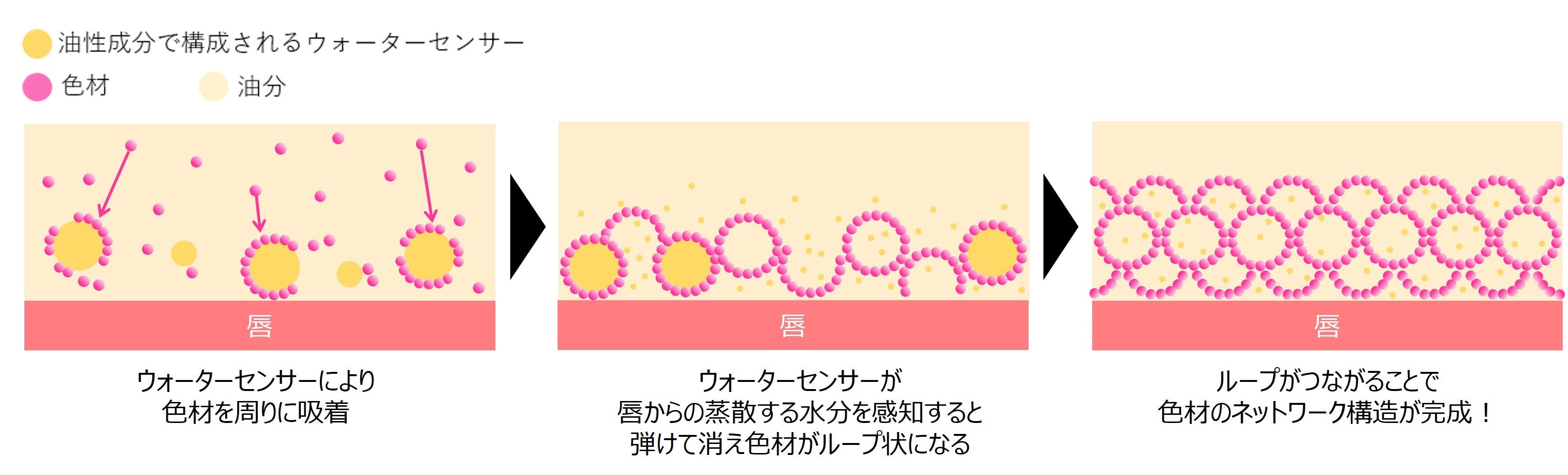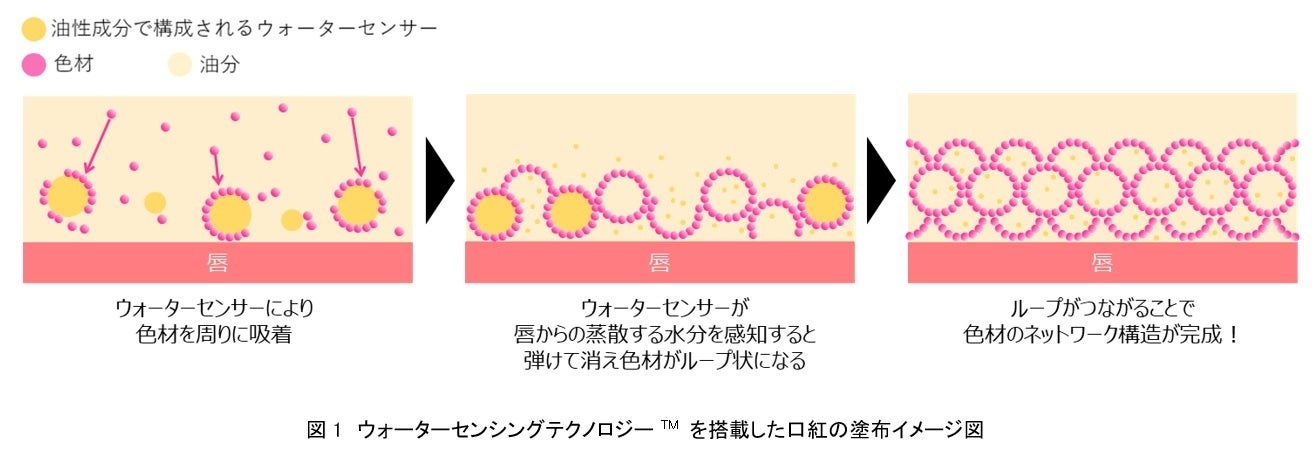 資生堂は、唇に塗布すると色材を集め、唇上で蒸発する水を感知して色材がネットワークを形成する「ウォーターセンシングテクノロジーTM」を開発しました。色材がループ状にネットワークを構成することで、色材一つ一つが離れにくく、唇に密着して高い色持ち効果を発揮します。加えて、色材を密着性の高い油や被膜剤で維持していたこれまでの口紅とは異なり、塗膜を固化しないため、なめらかで軽い付け心地と高い色持ち効果を両立した口紅製剤を実現することに成功しました。本技術は、2023年11月21日に発売する『マキアージュ ドラマティックエッセンスルージュ』に搭載されます。