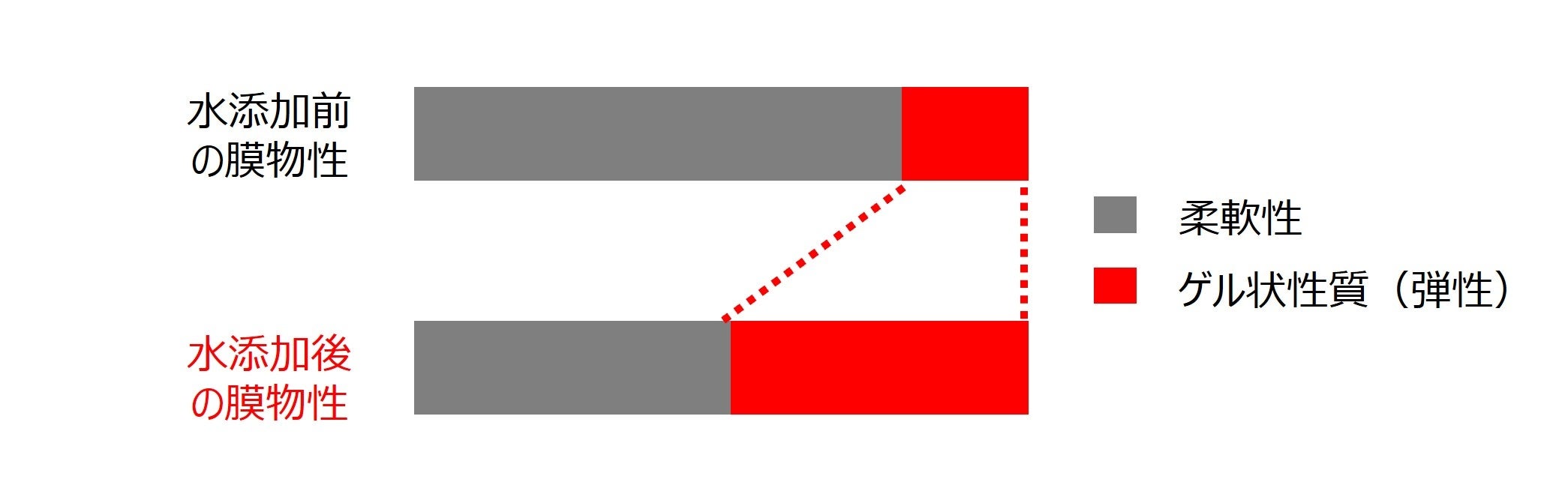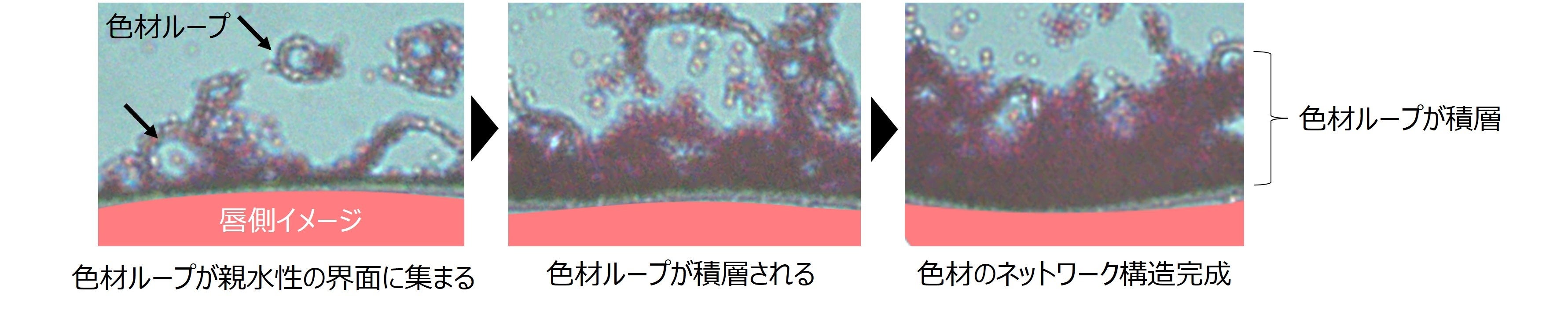 今回、唇上の水と相性の良い油性成分に着目し、新しいアプローチでの色持ち、二次付着レス効果の向上を試みました。開発した「ウォーターセンシングテクノロジーTM」は、唇に塗布すると色材を集め、唇上で蒸発する水を感知して、色材はループを形成します。その色材ループは水と相性がよいため、色材ループが唇のような親水性の界面に集まり、つながることで色材の強固なネットワーク構造が完成し(図1,2)、色持ちの良さが実現します。また、本技術を搭載した口紅の膜性質を調べると、塗布中はなめらかで液体のような流動性を示しており、塗布後に水と反応しネットワーク形成すると、流動性が弱まり、塗膜が心地よい程度のゲル状の性質(弾性)に変わることがわかりました。(図3)