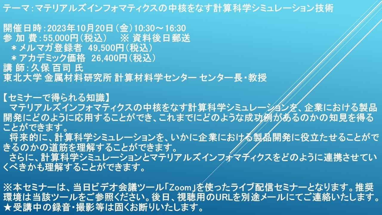 【ライブ配信セミナー】マテリアルズインフォマティクスの中核をなす計算科学シミュレーション技術 10月20日(金)開催 主催:(株)シーエムシー・リサーチ