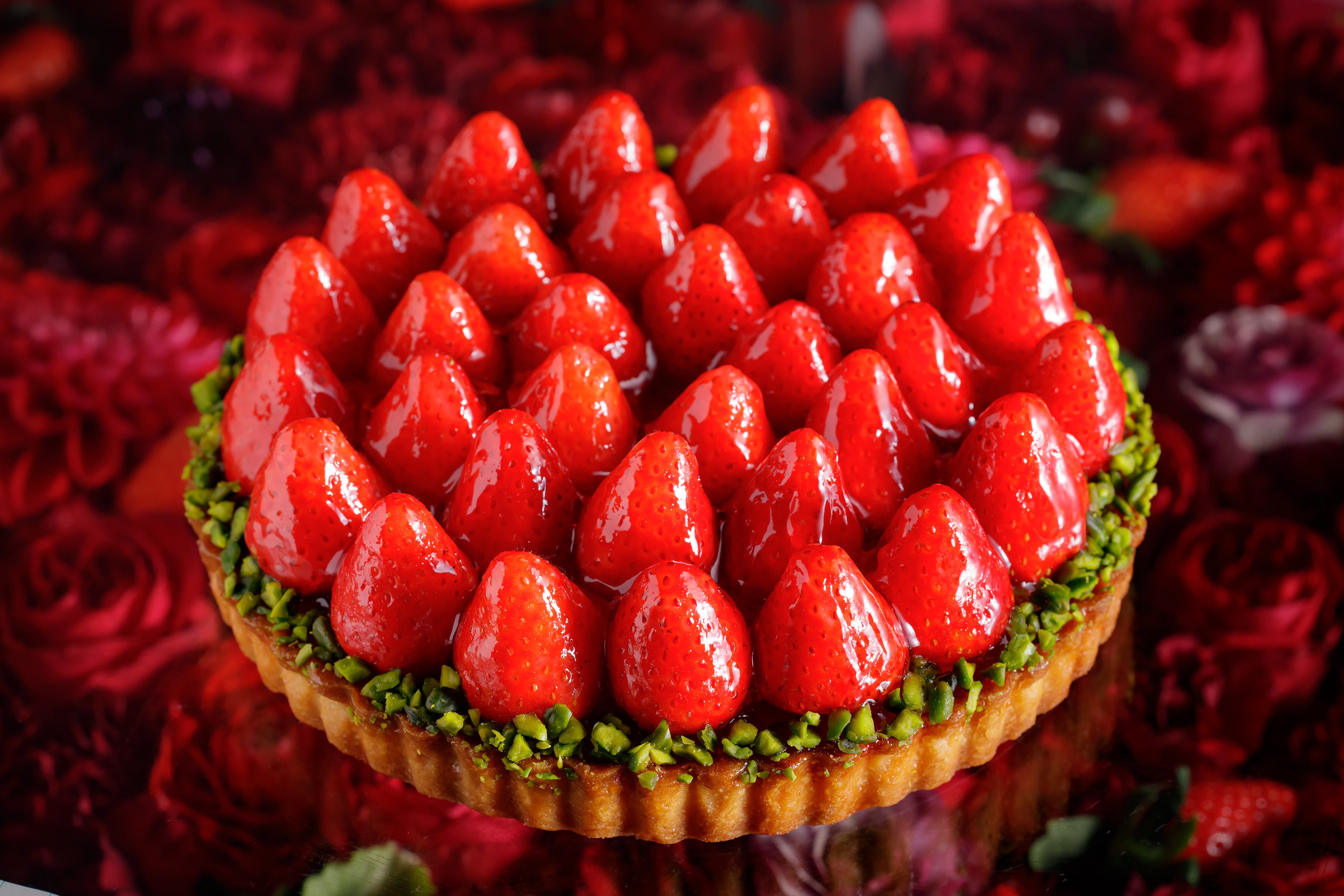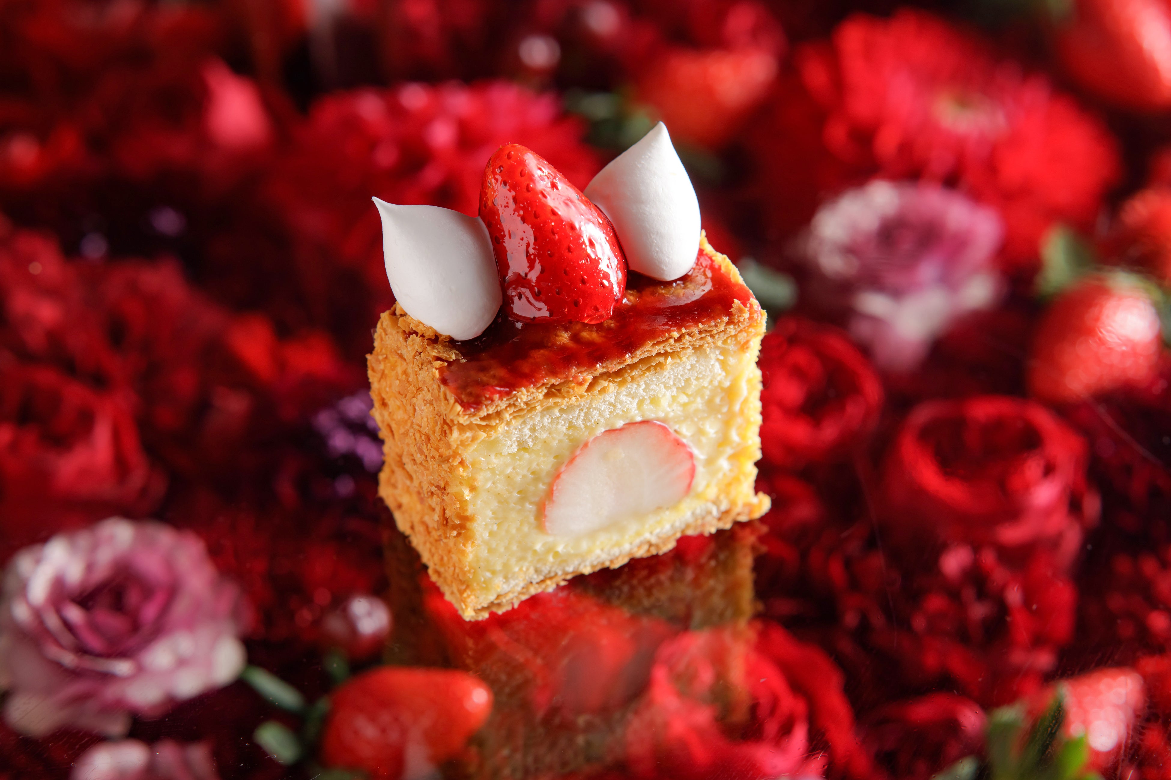 まるでジュエリーケースを思わせるような美しいショーケースには、見た目も華やかないちごスイーツがずらりと並びます。ホテル特製カスタードクリームとサクサクのパイ生地が自慢の「ナポレオンパイ」や、ロールケーキにタルトなど、15種以上のスイーツをご用意。