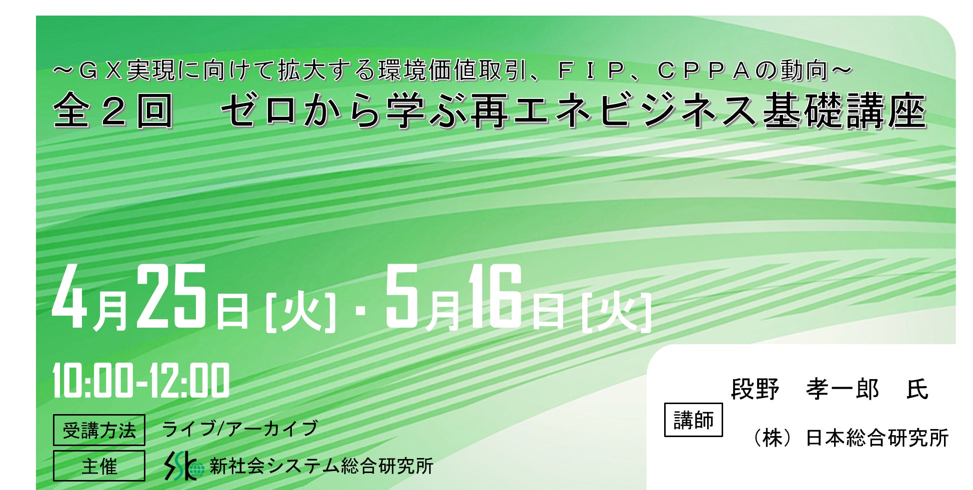 「全2回 ゼロから学ぶ再エネビジネス基礎講座」と題して、(株)日本総合研究所 段野 孝一郎氏によるセミナーを2023年4月25日(火)・5月16日(火)に開催!!