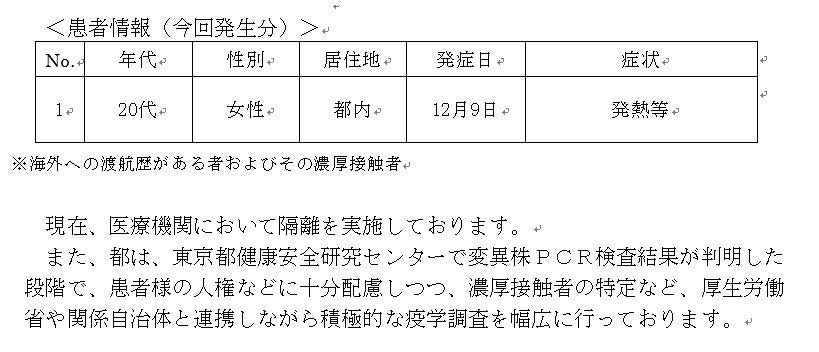 この度、同センターにおいて、1例について変異株PCR検査でオミクロン株疑いが確認され、ゲノム解析を行った結果、オミクロン株の陽性例が判明したので、下記のとおりお知らせします。